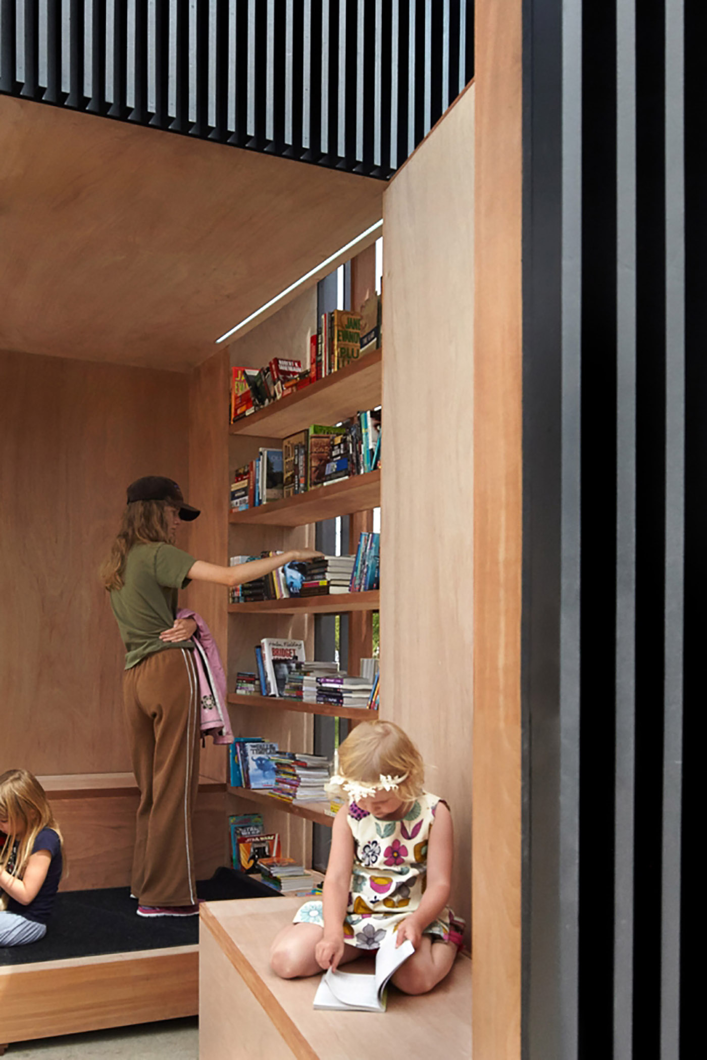 Durante il giorno, due delle pareti del The Story Pod si aprono come le copertine di un libro, accogliendo i lettori di passaggio. I visitatori possono prendere o lasciare qualcosa da leggere, o approfittarne per accomodarsi nei posti a sedere integrati alla struttura. Di notte, quando le porte sono chiuse, le luci accese all’interno, LED a basso consumo energetico alimentate da pannelli solari sul tetto, filtrano attraverso il reticolo di lamelle in legno trasformando The Story Pod in una lanterna urbana che fornisce un’atmosfera unica per mercatini notturni o eventi della comunità