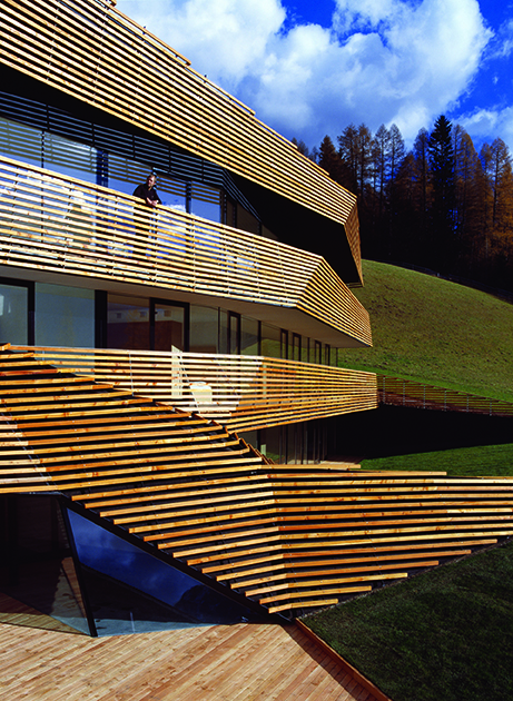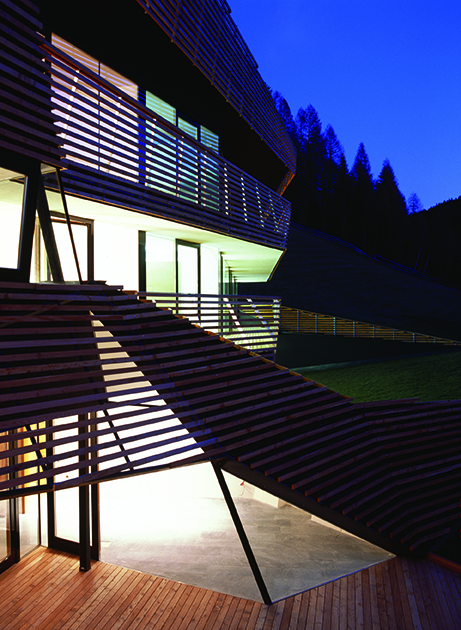 Plasma Studio progetta un edificio nelle Dolomiti italiane. Caratterizzato dalla geometria complessa, l'Hotel è esternamente ricoperto da fasce lignee che lo avvolgono e lo confondono con il territorio