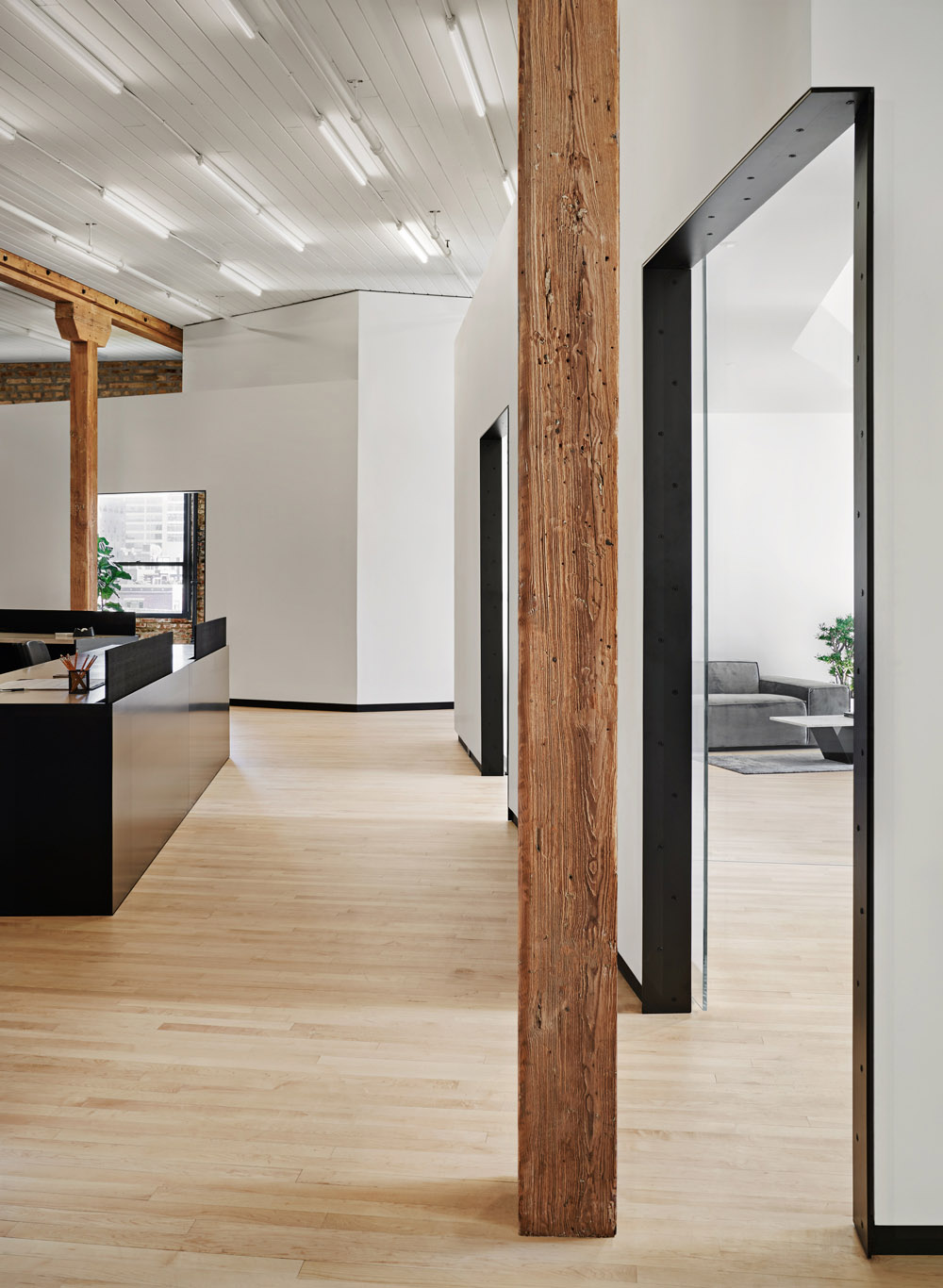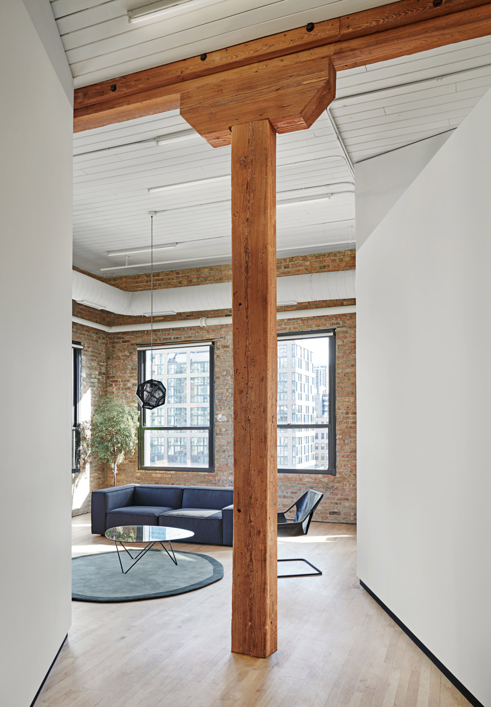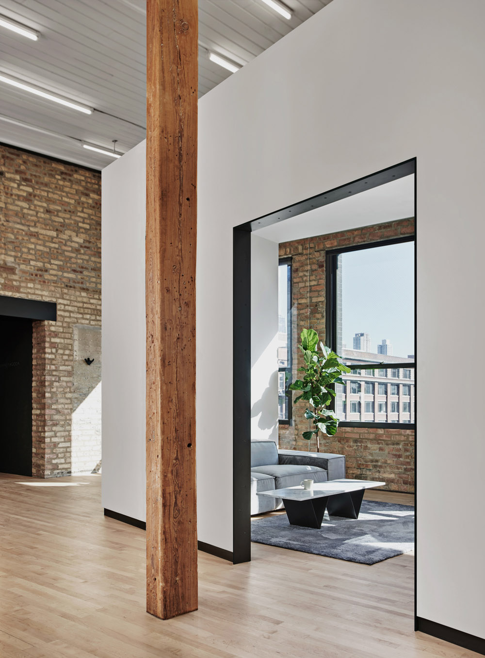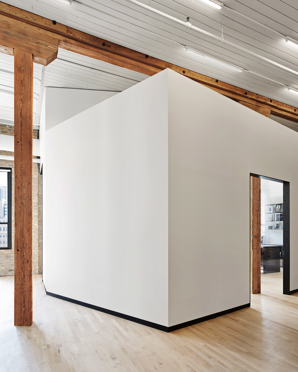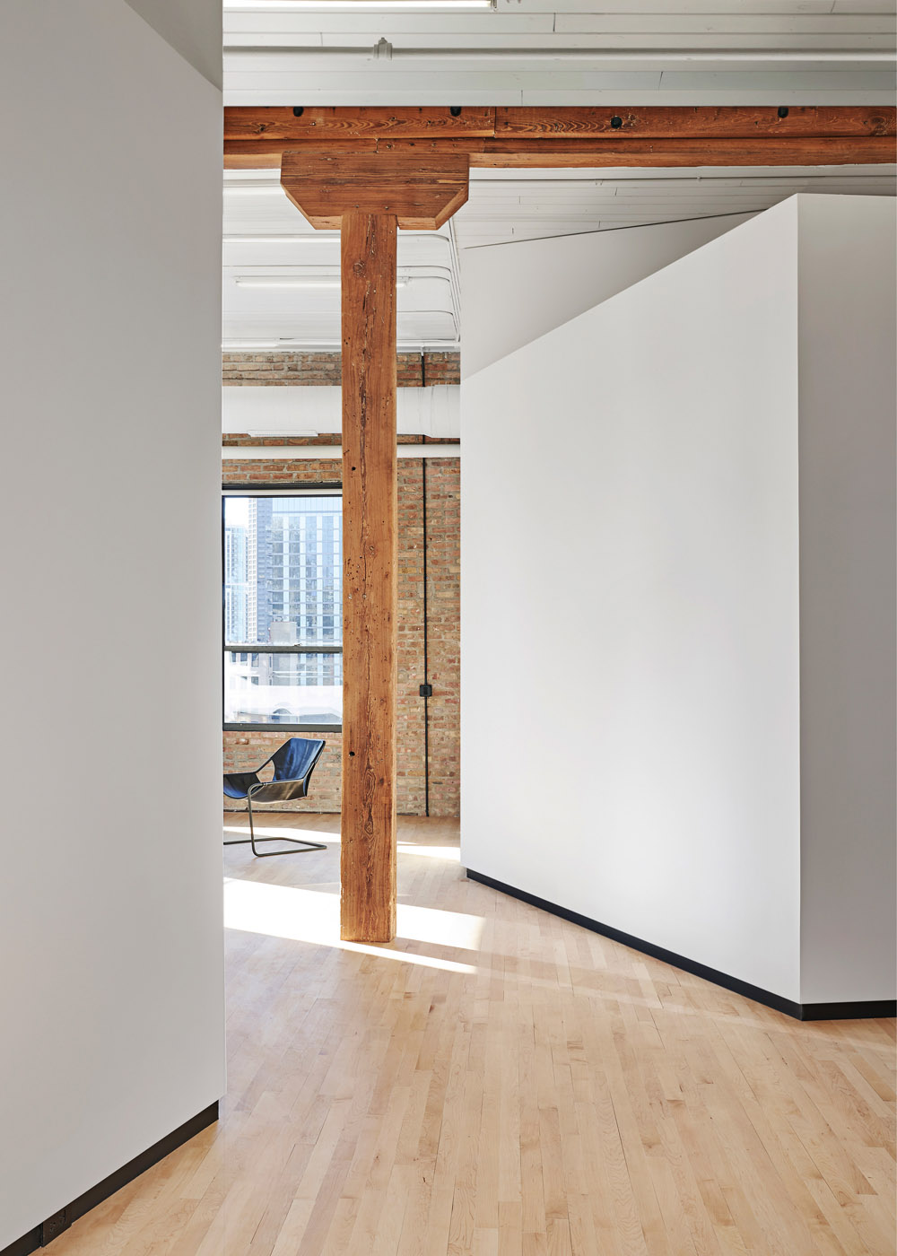 Il sottotetto, situato a Chicago, gode di una vista sui treni sopraelevati e sulle architetture più iconiche della città, e dai clienti è subito stato ritenuto uno spazio ideale per il loro nuovo studio legale. Il piano ristrutturato presenta una configurazione coreografica di pali, nuove partizioni, aperture e circolazioni