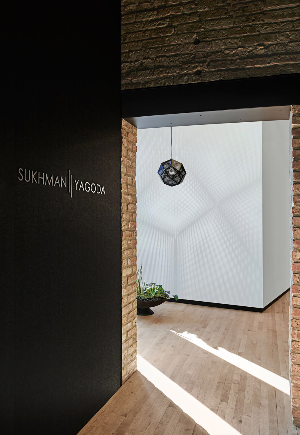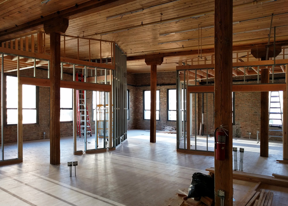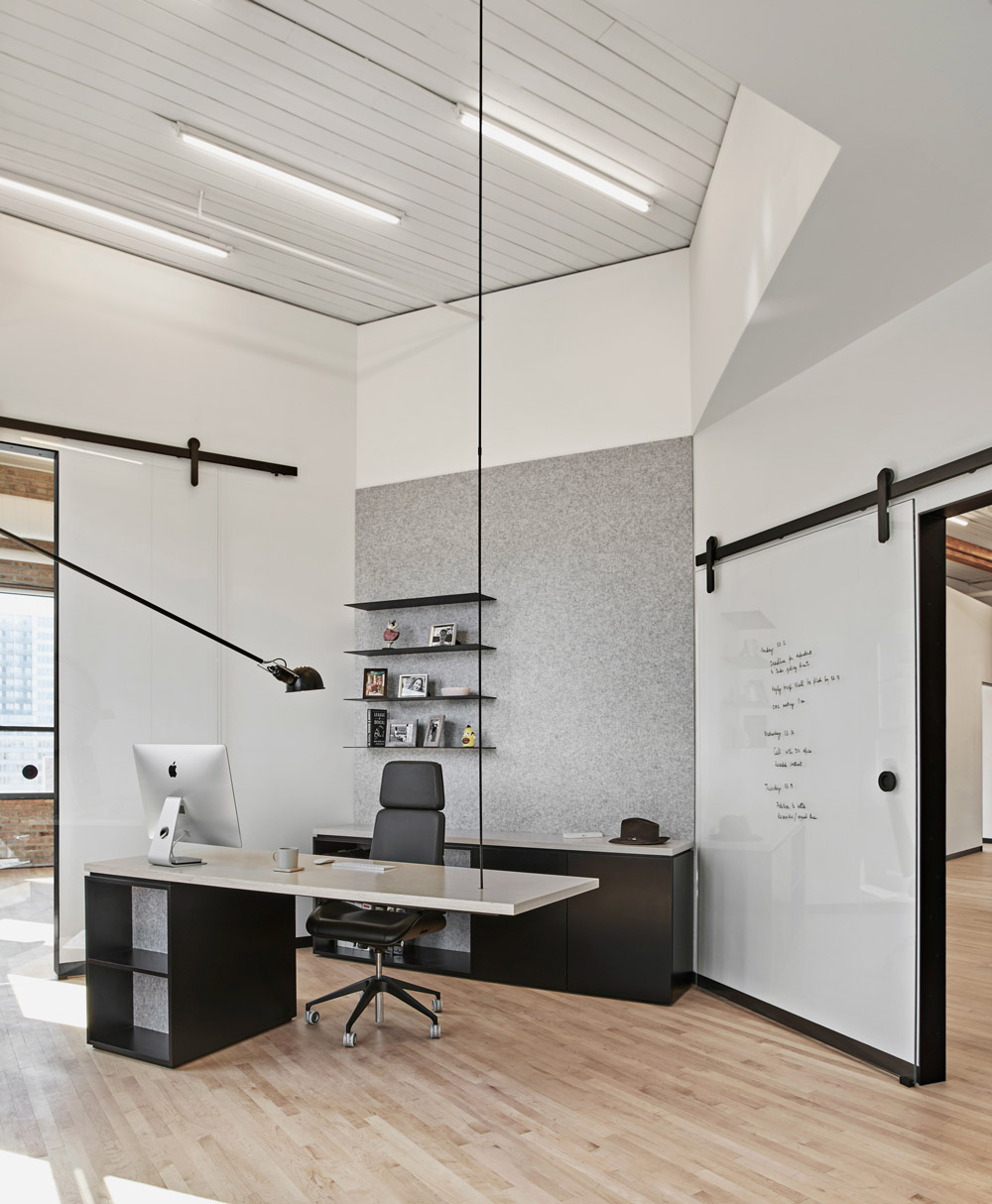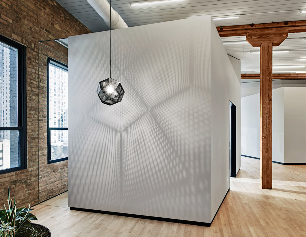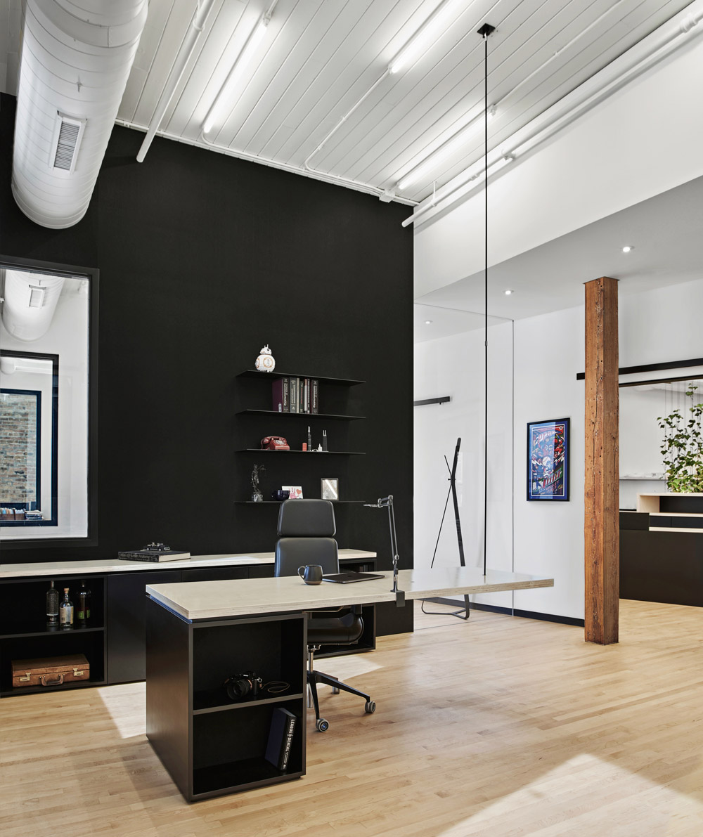 Il sottotetto, situato a Chicago, gode di una vista sui treni sopraelevati e sulle architetture più iconiche della città, e dai clienti è subito stato ritenuto uno spazio ideale per il loro nuovo studio legale. Il piano ristrutturato presenta una configurazione coreografica di pali, nuove partizioni, aperture e circolazioni
