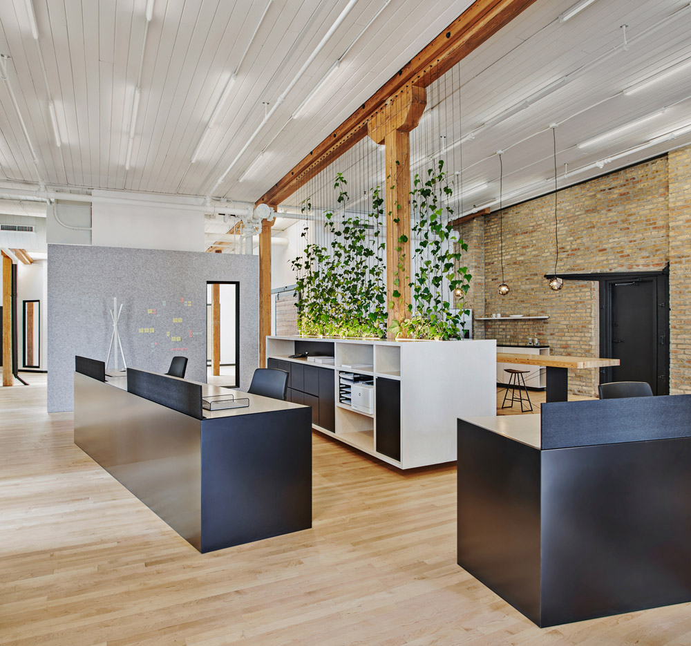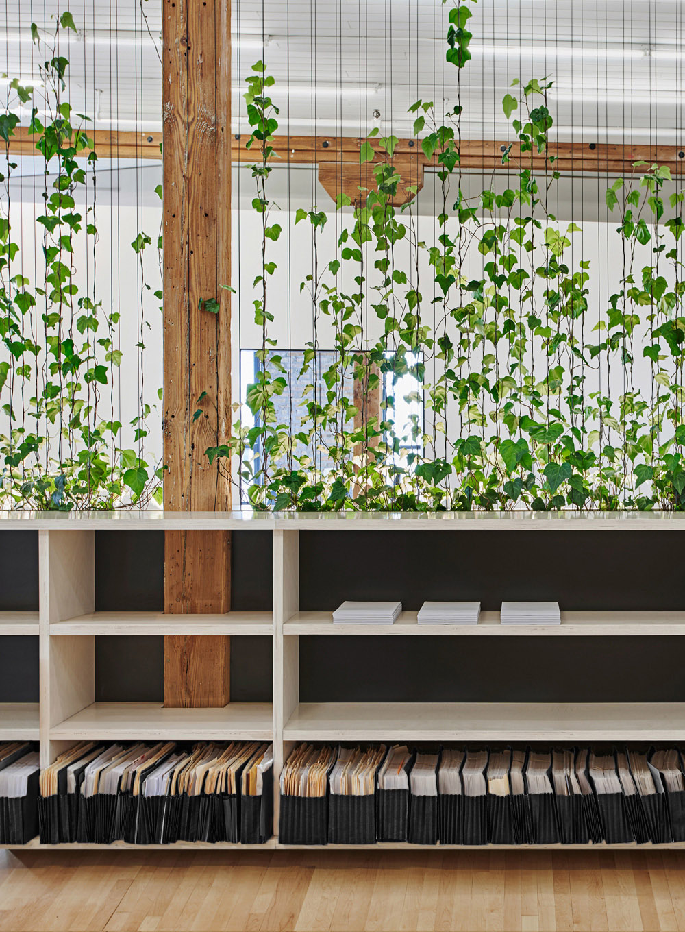 Le aperture, che fungono anche da condotti visivi e facilitano l'ingresso della luce solare in tutti gli spazi, sono sottolineate tramite l'uso di acciaio annerito. L'uso dell'edera sottolinea il cuore dell'ufficio e separa lo spazio di lavoro da quello dell'angolo cottura