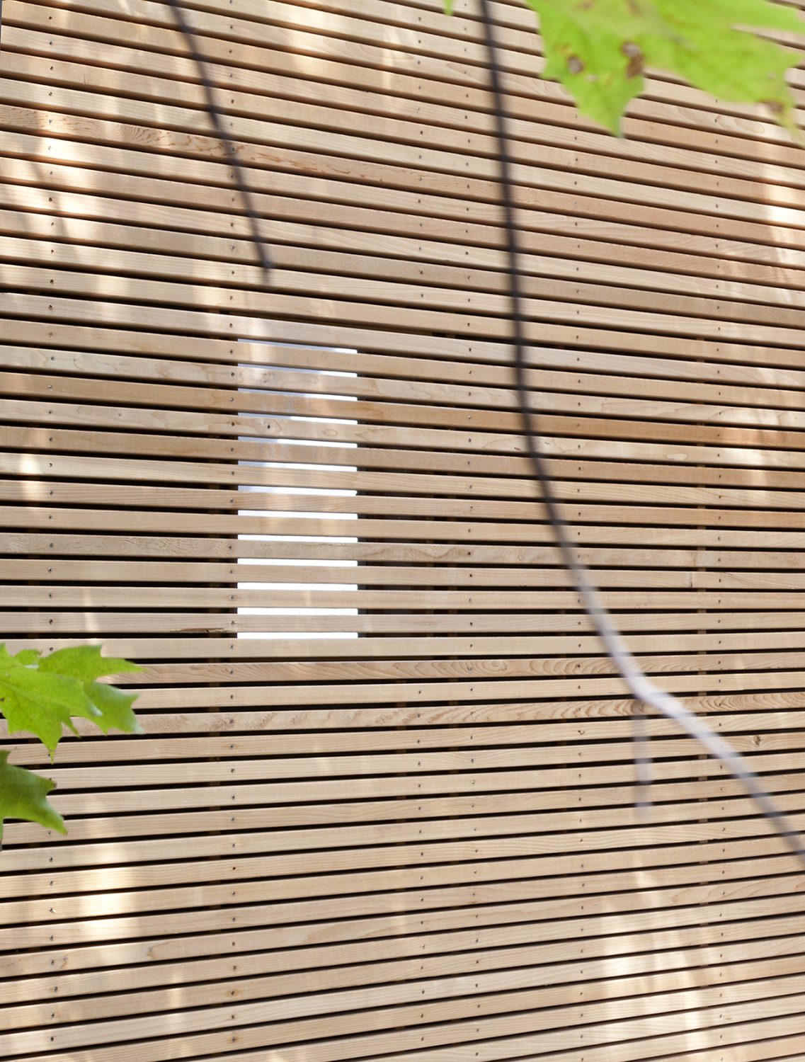Il processo di costruzione ha richiesto solo 4 mesi. Finestre, porte e lucernari in legno sono stati costruiti appositamente per questo spazio. L’edificio è raggiungibile da est da una rampa di legno leggermente in pendenza, sul lato sud si trova un’altra rampa di legno che è una grande parete girevole. La luce naturale proviene dagli ampi lucernari, tagliati per ottenere la maggior luminosità possibile ed eliminare, per la maggior parte delle ore, la necessità di energia elettrica