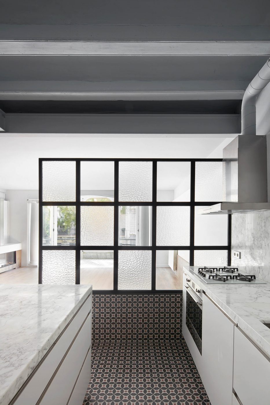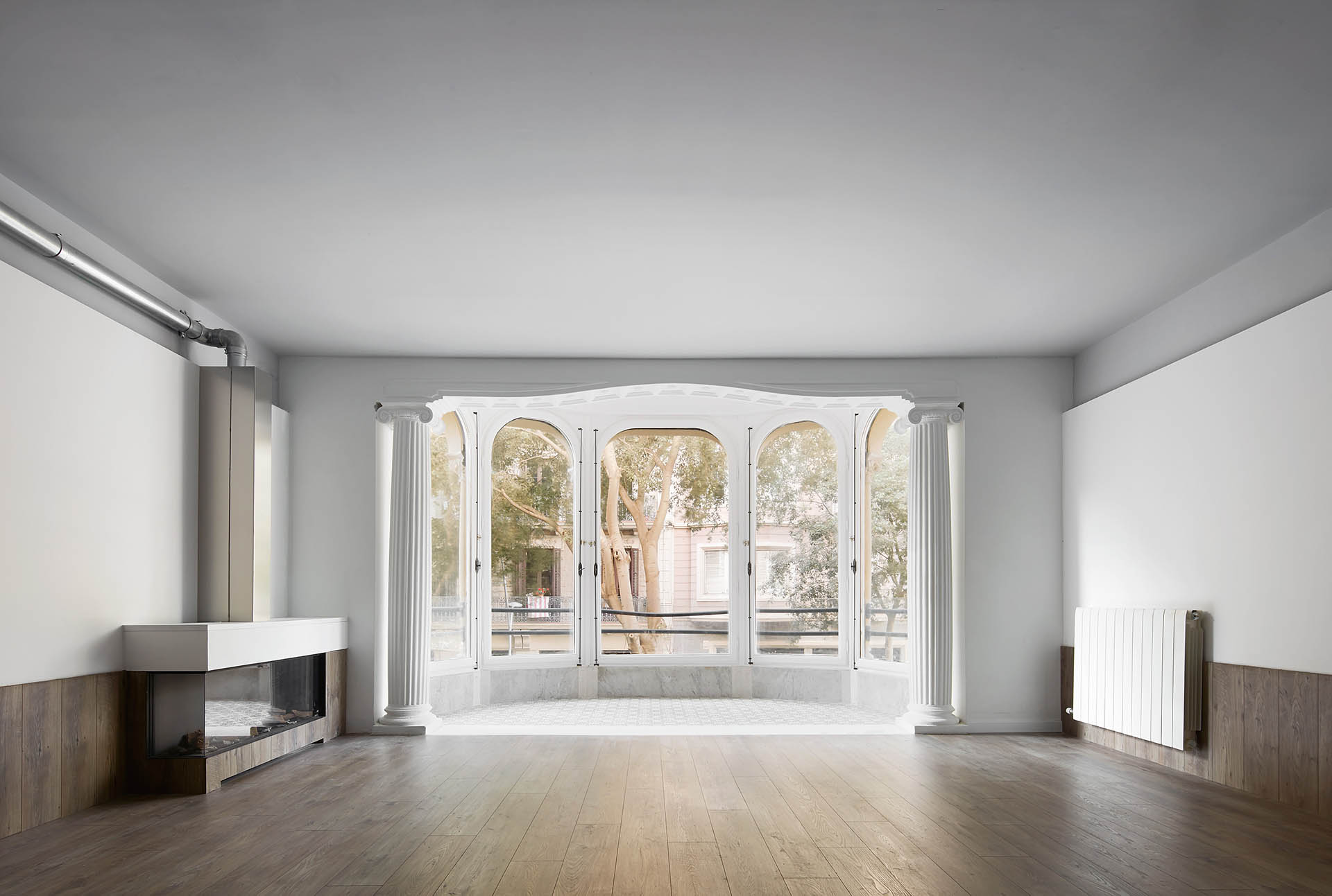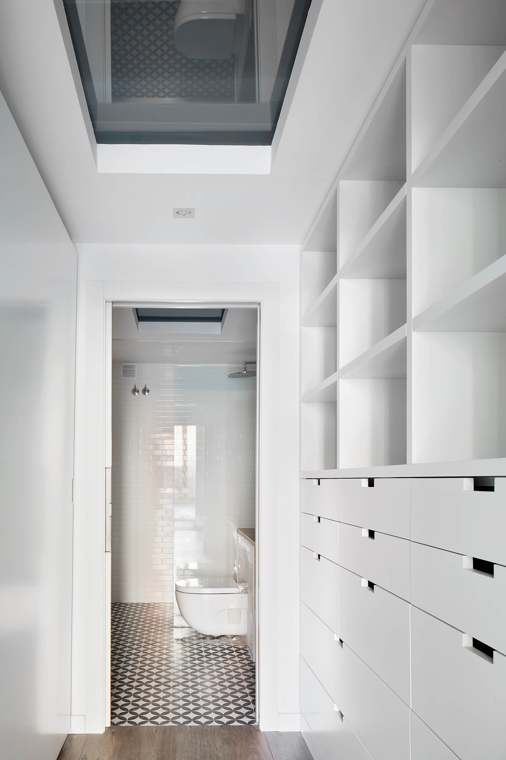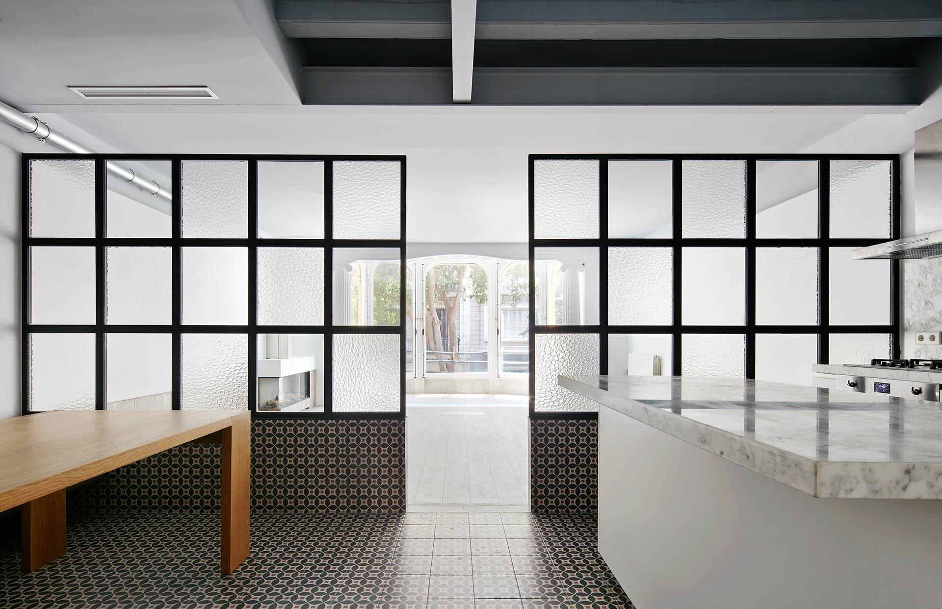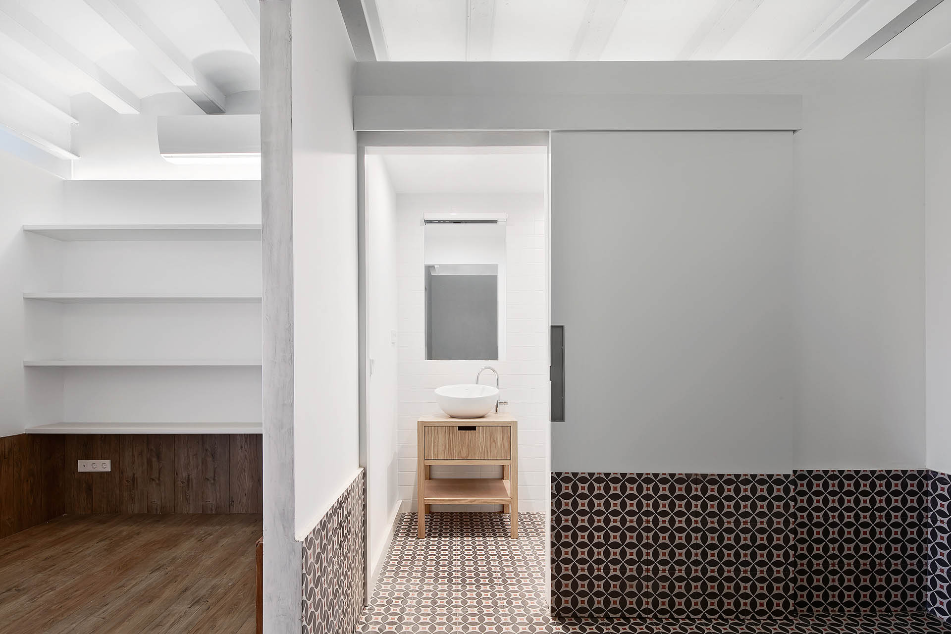 Le soglie che collegano le stanze caratterizzano un nuovo materiale, il micro-cemento bianco, che copre altrettanto le partizioni all'ingresso, che è stato riordinato per stabilire chiaramente gli spazi pubblici di fronte alla strada e gli spazi privati affacciati sul cortile interno