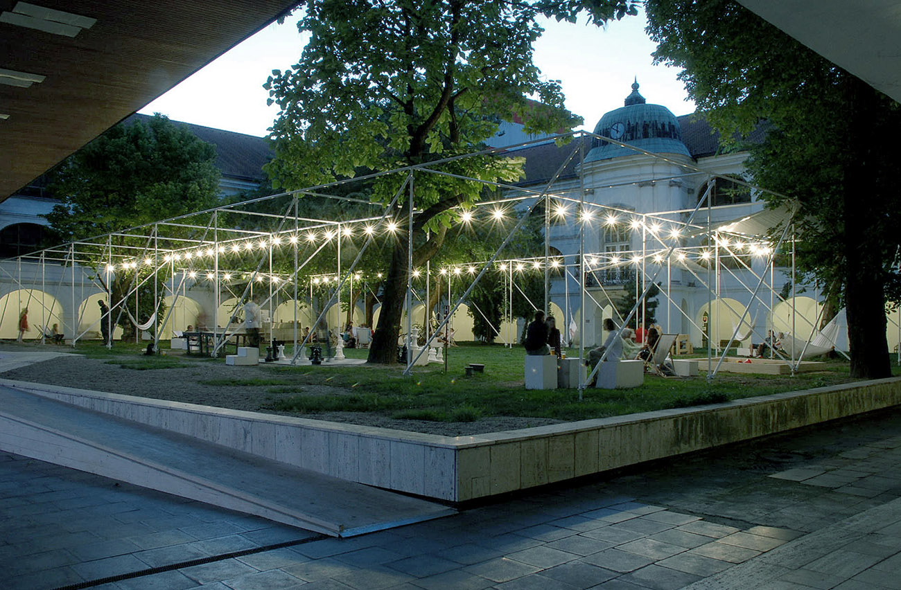 Gli architetti Martin Jančok e Aleš Šedivec hanno creato un padiglione che è monumentale e invisibile allo stesso tempo. Il padiglione genera una specifica condizione spaziale che racchiude l'area centrale contornata da un bordo di celle dipinte di bianco di 4x4x4 metri per contenere varie attività. La chiara forma architettonica doveva essere abbastanza sottile da non distogliere l’attenzione dall’edificio che accoglie il museo e da permettere all'erba e agli alberi nel cortile di distinguersi