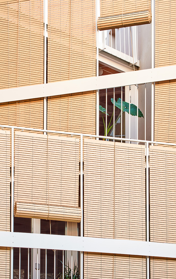 Questa composizione terrazze-patio è il dispositivo che garantisce l'illuminazione naturale e la ventilazione. Una chiusura pieghevole permette di trasformare lo spazio in una galleria chiusa in funzione del periodo dell'anno. Questi annessi all’aperto sono zone polivalenti che costituiscono il centro di gravità di ogni abitazione. La terrazza superiore è condivisa e dispone di due accessi indipendenti