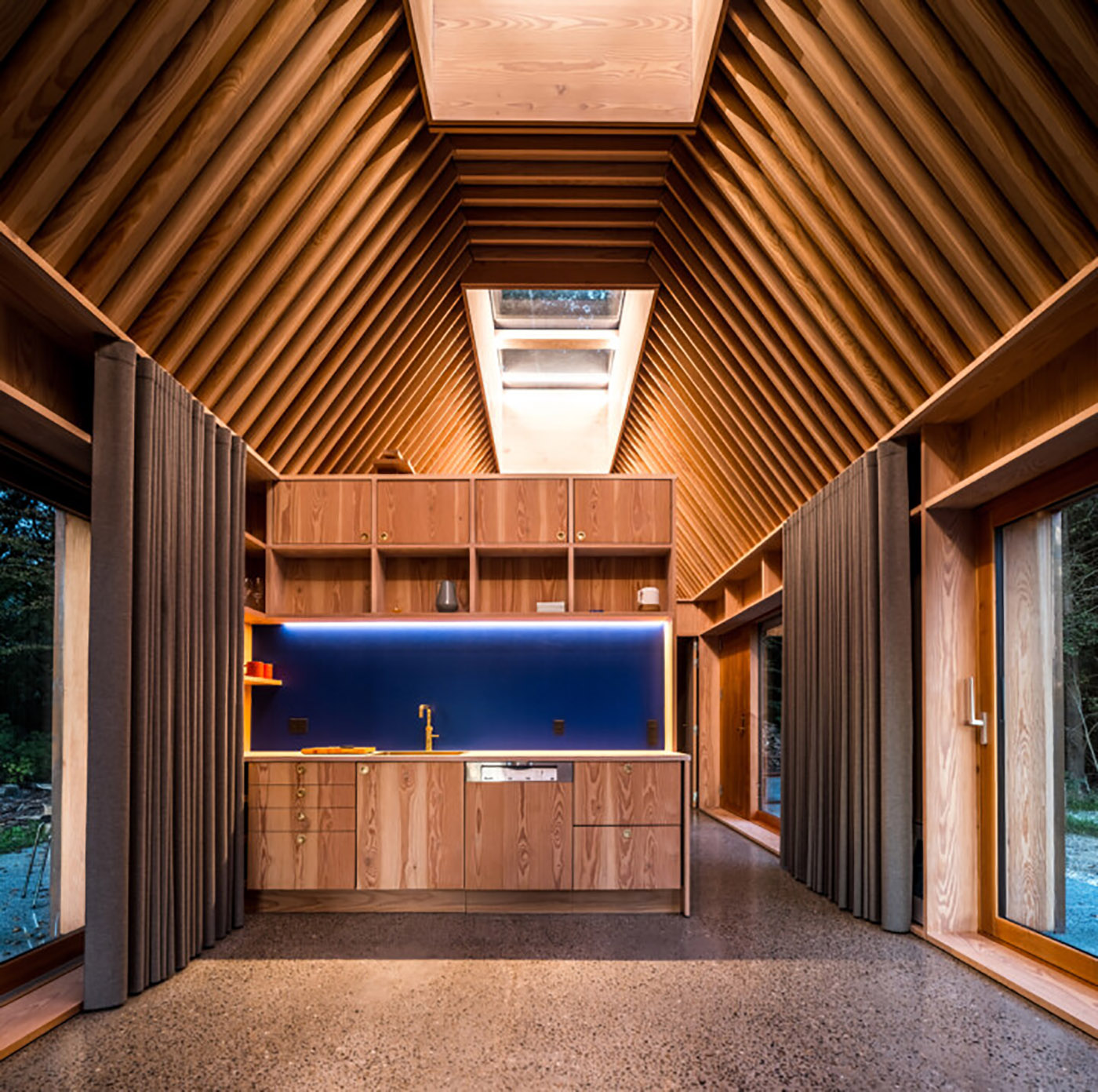 All'esterno, la facciata di rame bruno-rossastro scuro si fonde con la foresta e i faggi color rame del sito; la patina del tempo renderà la Author’s House di SLETH gradualmente sempre più verde, con l’avanzare dell’ossidazione del rame