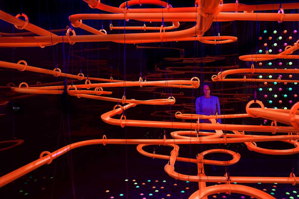 La composizione di percorsi abbaglianti e interconnessi crea una forma scultorea, mentre i suoni metallici di palle che rotolano intorno a queste strade hanno un effetto invitante