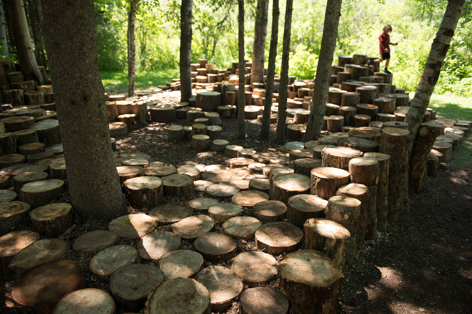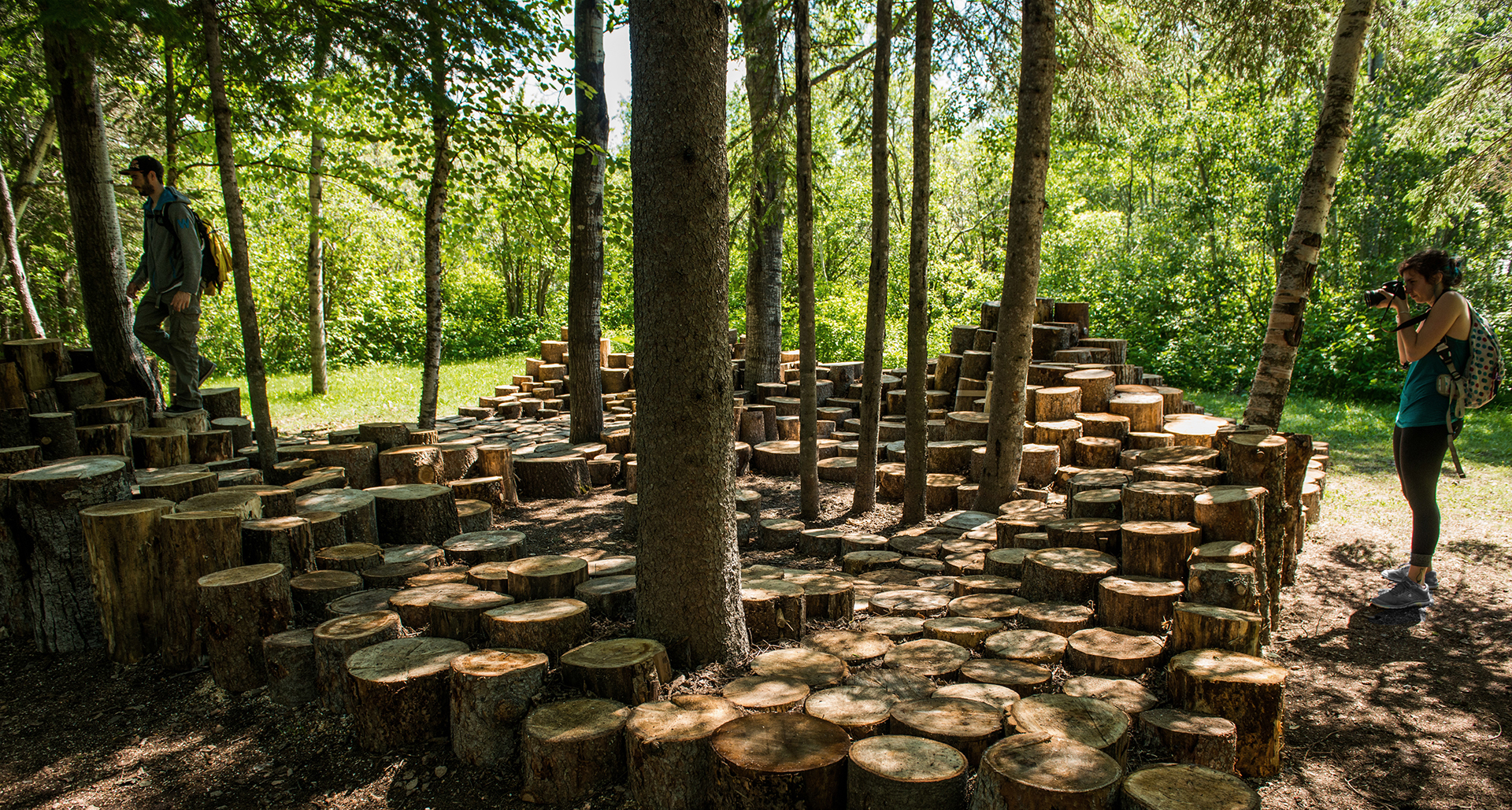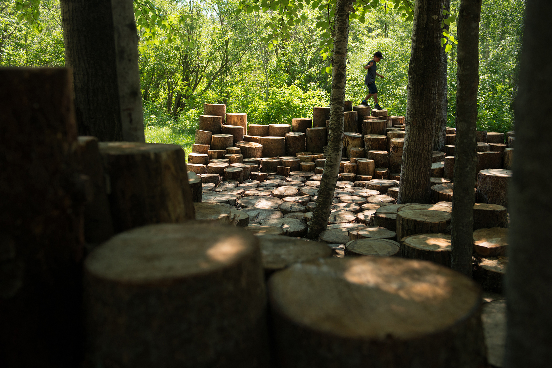 L'assemblaggio denso e verticale di tronchi di legno di varie altezze che si estendono su una superficie di 64 m2 offre una nuova topografia e definisce uno spazio accessibile a tutti coloro che solleticano l'immaginazione