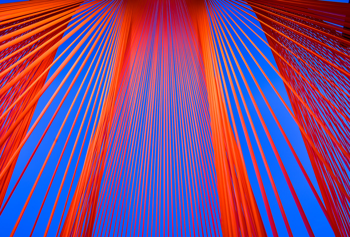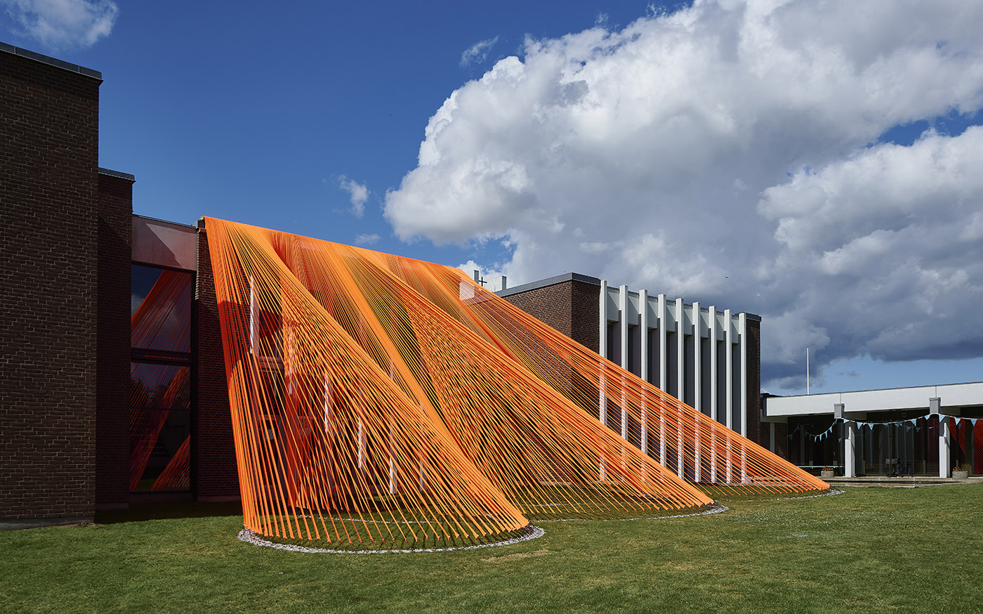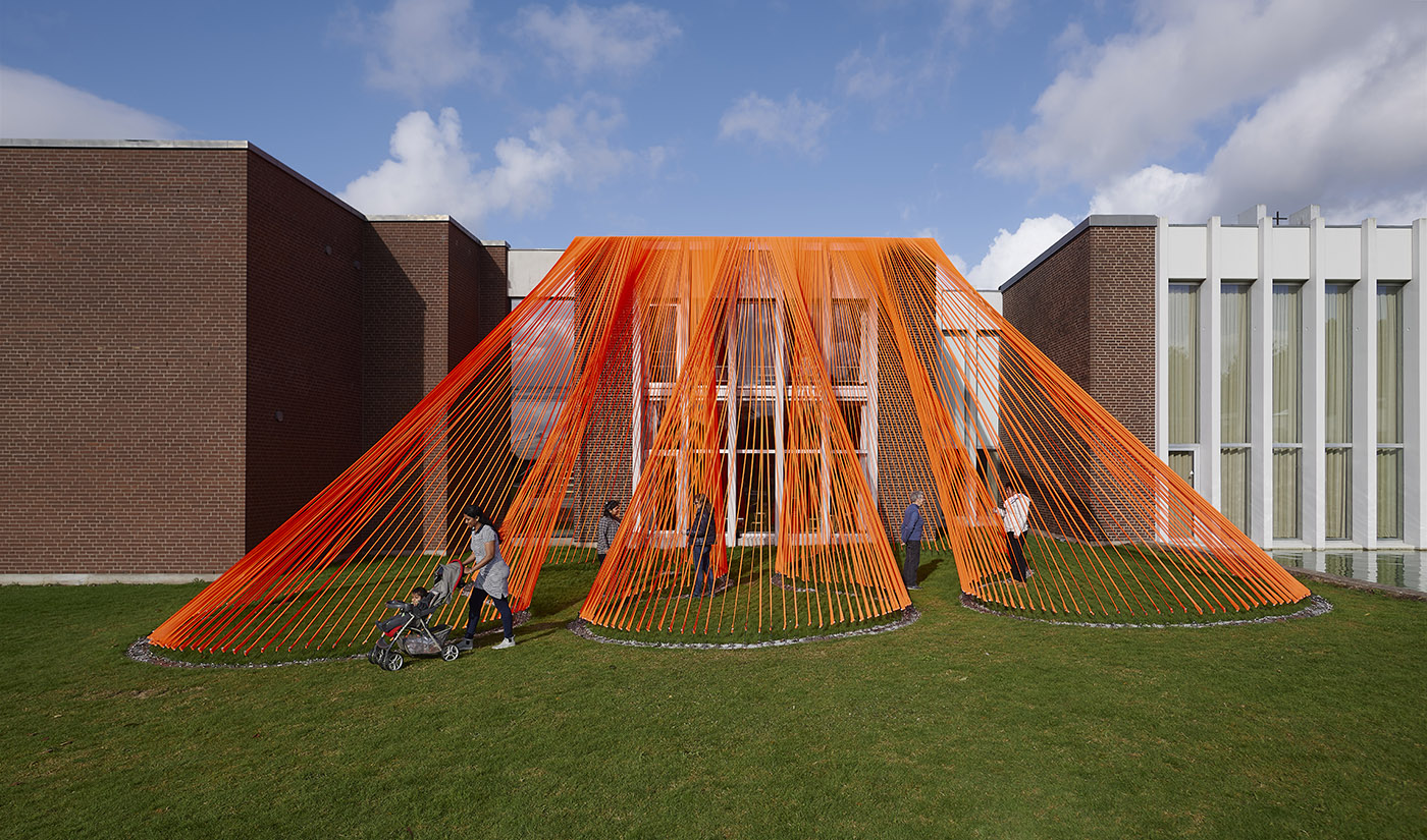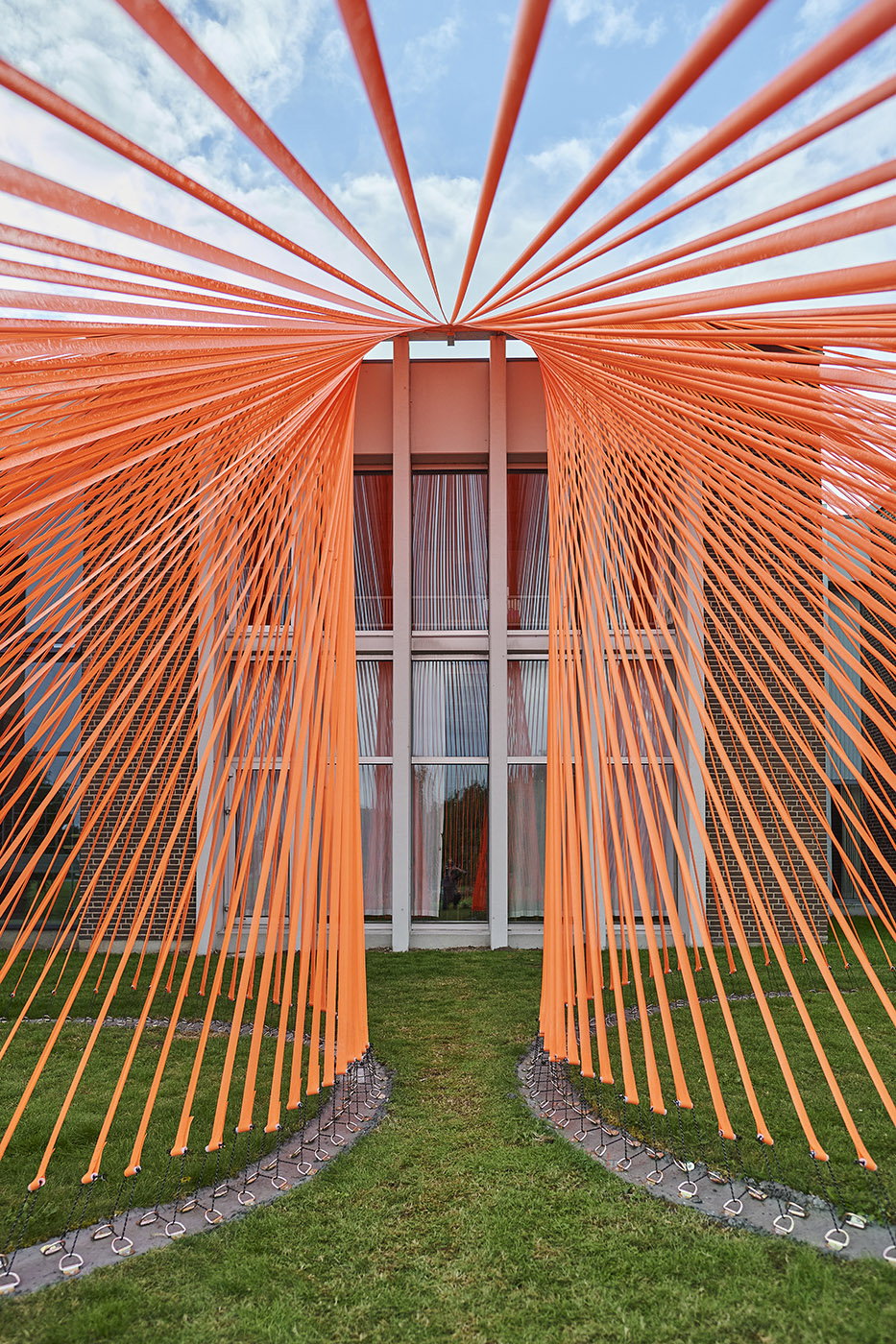 Un padiglione di fili arancioni. Uniti ma separati per riflettere sul momento storico che stiamo vivendo