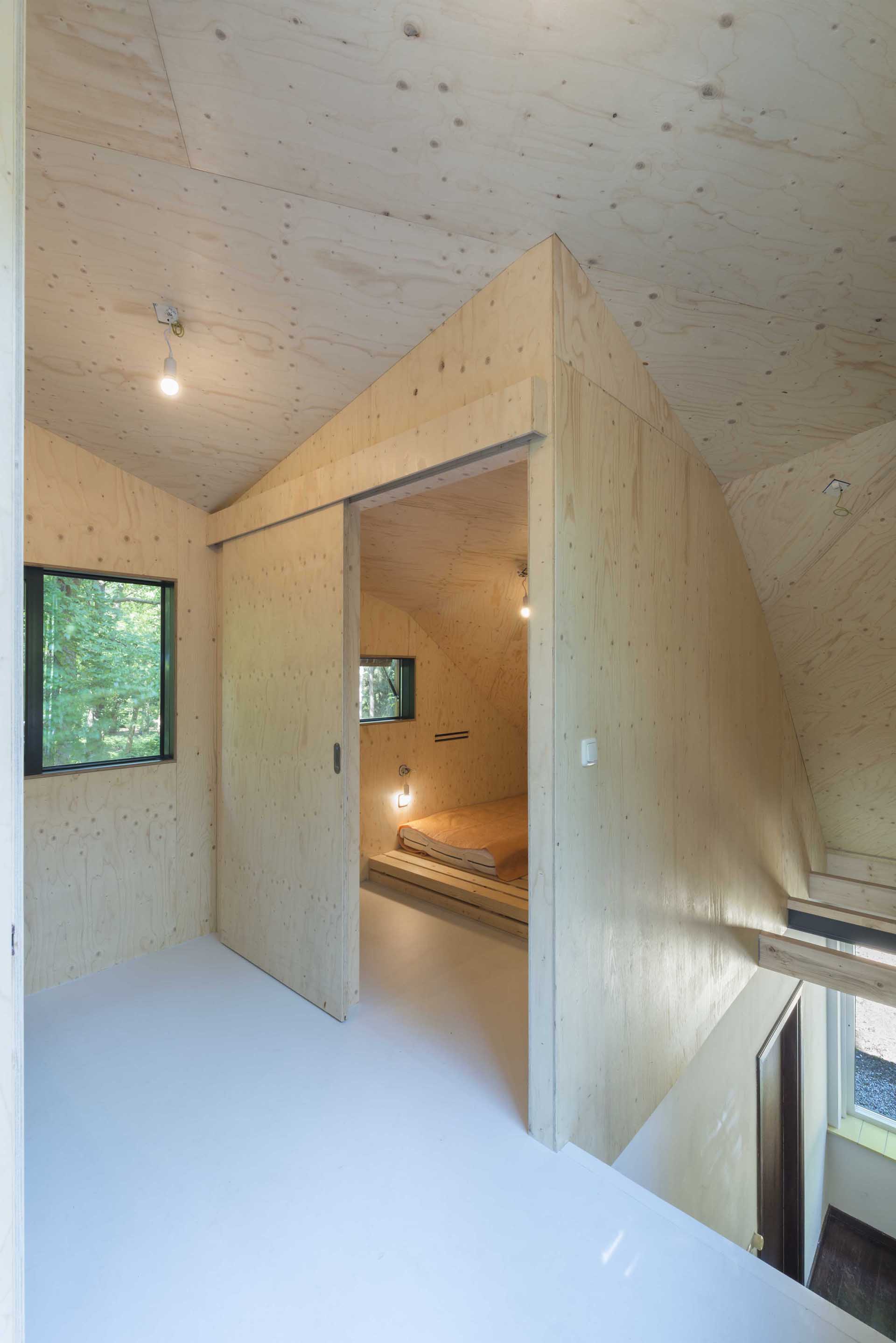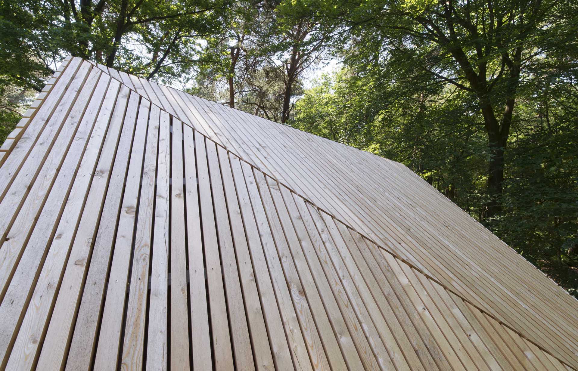 Una casa vacanze risalente al 1950, nascosta nella foresta, è stata ampliata modificando il tetto scultoreo, compatto e sostenibile. La copertura emerge dalla struttura originale e cerca la sua strada verso il grande panorama sulla prateria delimitata dalla foresta