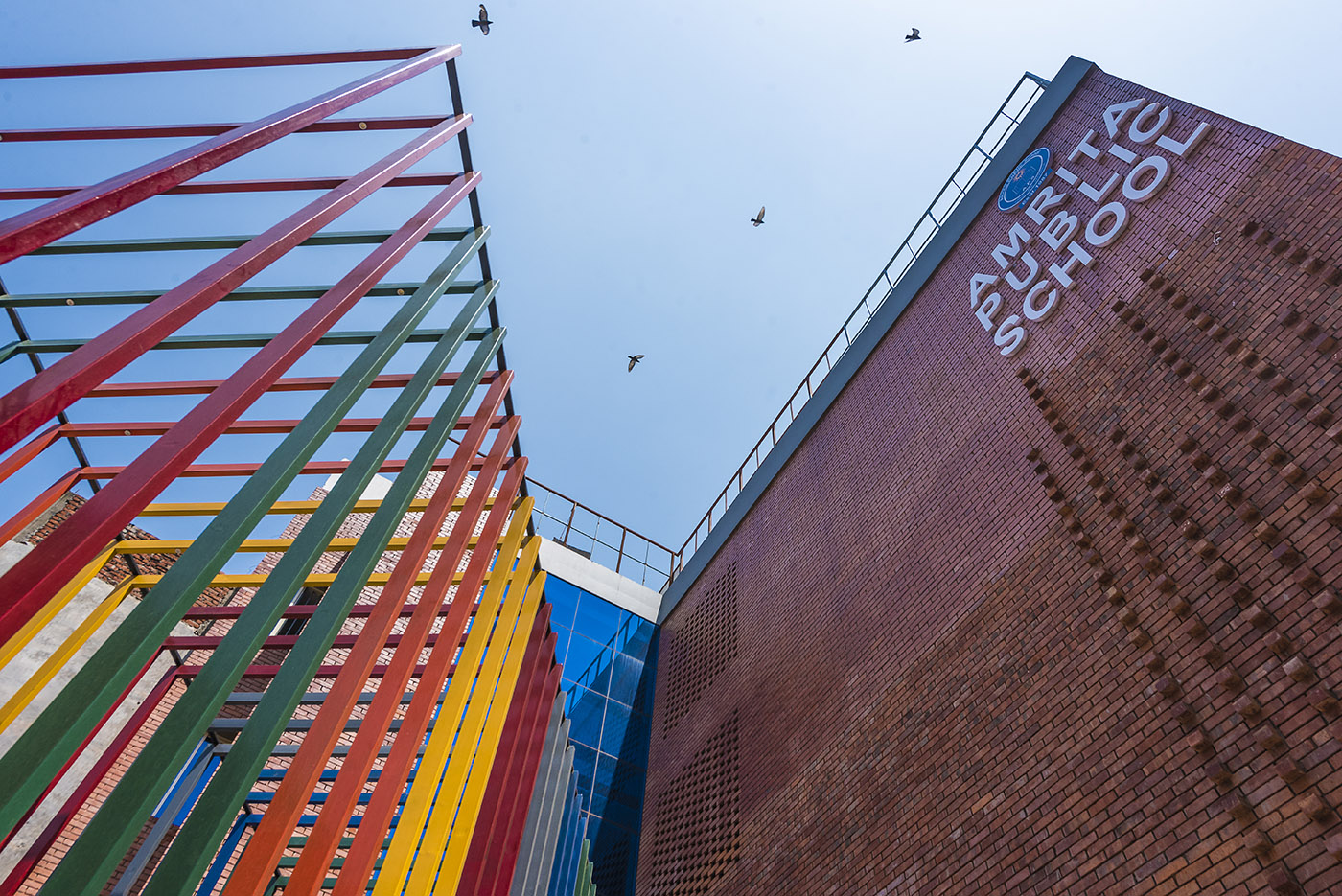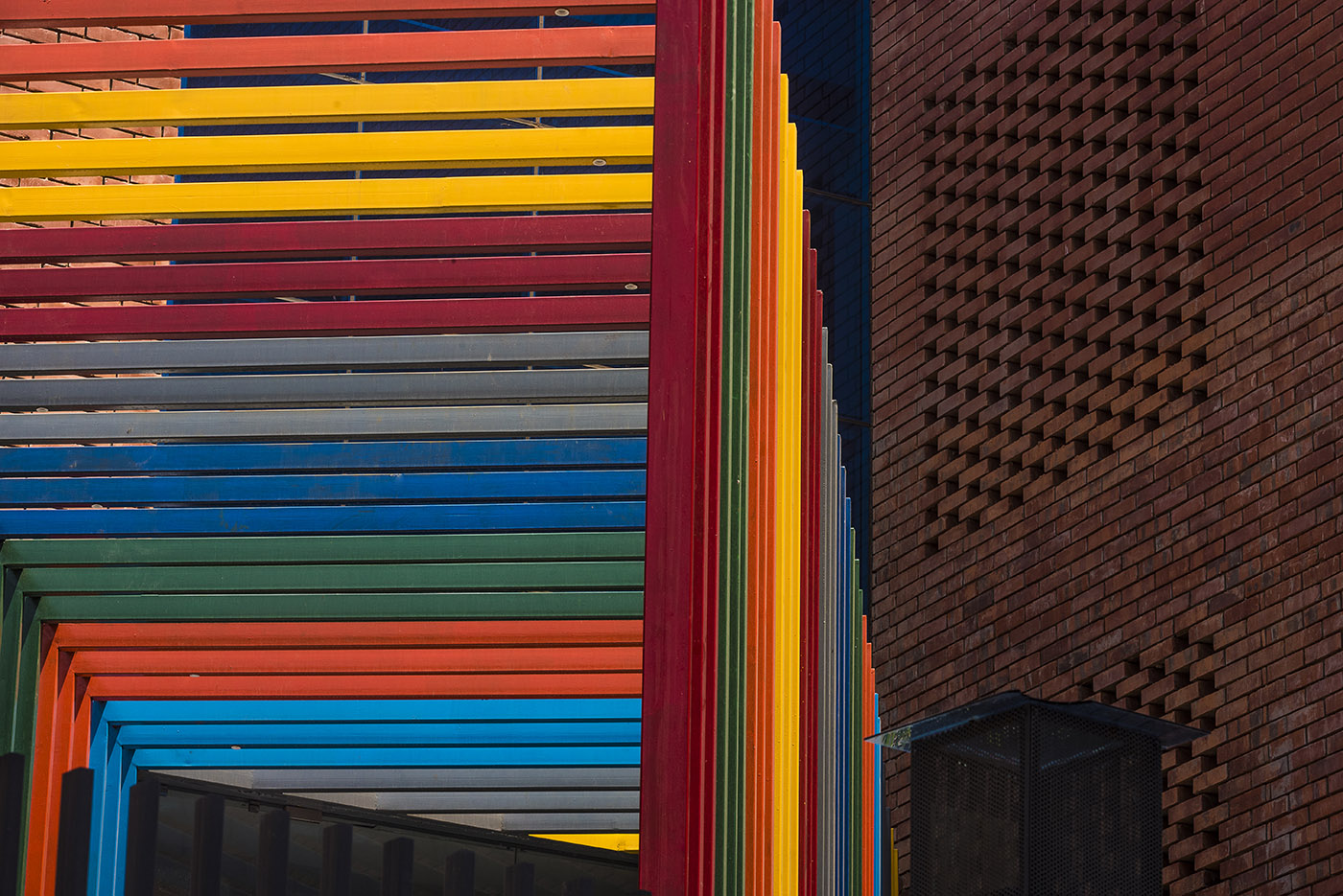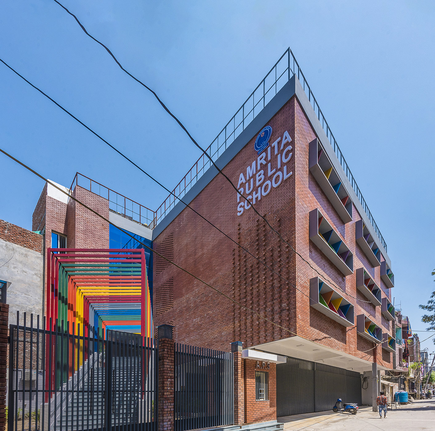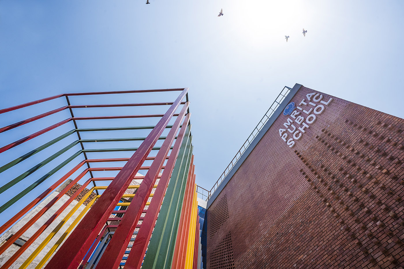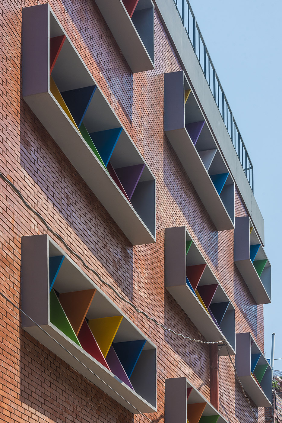Un’edificio caratterizzato da una facciata in mattoni che da un effetto molto naturale e si fonde con la vegetazione intorno e da lamelle colorate che decorano e proteggono le finestre caratterizzando l’edificio esteticamente e preannunciando la funzione che ospita all’interno. Le colorate alette triangolari sulle finestre ricordano delle bandiere decorative e aggiungono allegria e gioia