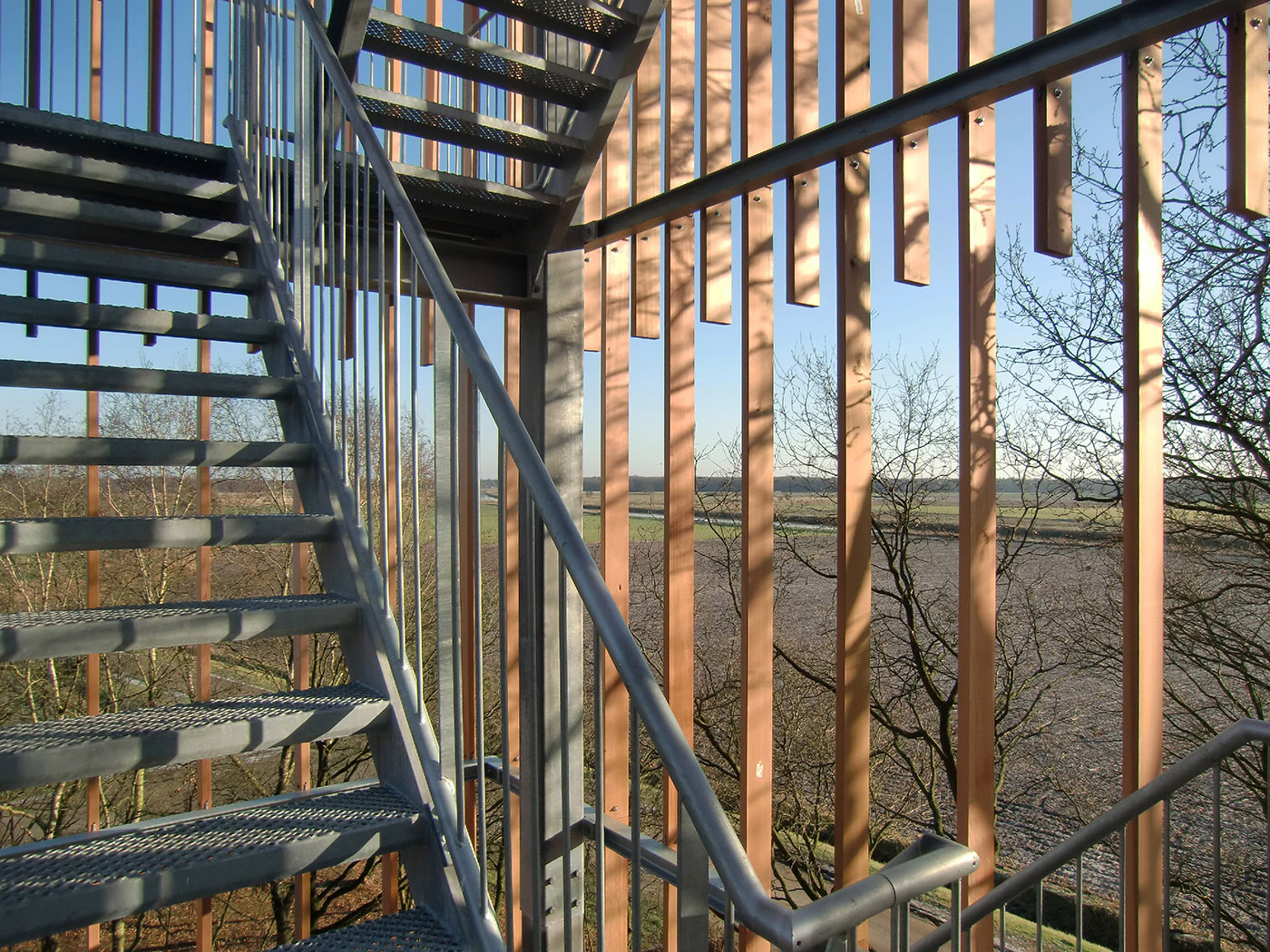 La torre presenta la struttura e le scale in acciaio. Vista da lontano, la torre sembra essere molto chiusa, diventando un punto di riferimento nel paesaggio. Tuttavia, trovandosi su di essa, i visitatori attraverso le doghe in legno, possono facilmente ammirare il paesaggio circostante dall'interno