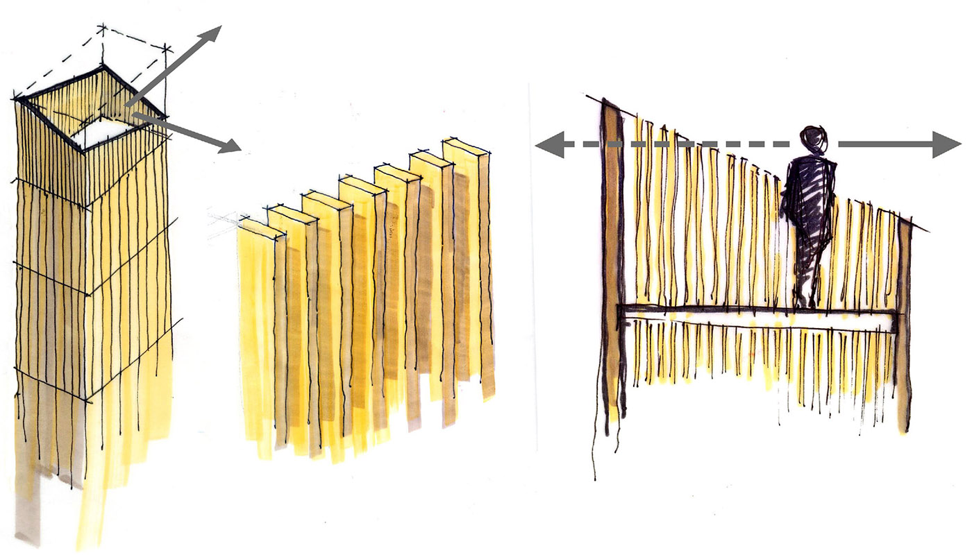 Dal basso verso l'alto, le lamelle sono sempre più vicine tra loro, e la vista, per i visitatori, è sempre più limitata, suscitando curiosità. Si può sbirciare il paesaggio tra le fessure, fino all'altezza di 18 metri, in cui una piattaforma panoramica offre una vista orientata e focalizzata sul Vechtdal