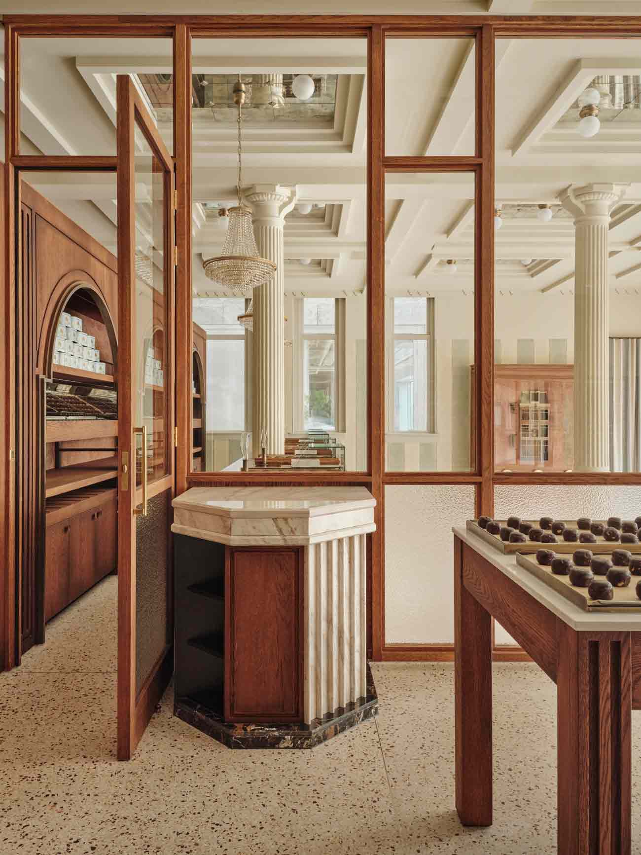 Dal 2013, Van Stapele sforna i migliori biscotti di Amsterdam: un unico biscotto al cioccolato fondente con un cuore di cioccolato bianco. Il suo segreto? Una ricetta esclusiva che ha reso questo dolce un’icona della città, generando ogni giorno lunghe code davanti al negozio. Inizialmente situata in un piccolo vicolo nel centro, la popolarità della pasticceria ha reso necessario un trasferimento in uno spazio più ampio. Studio Modijefsky è stato incaricato di mantenere intatta la magia del locale originale, ricreandone l’atmosfera in un contesto più grande.