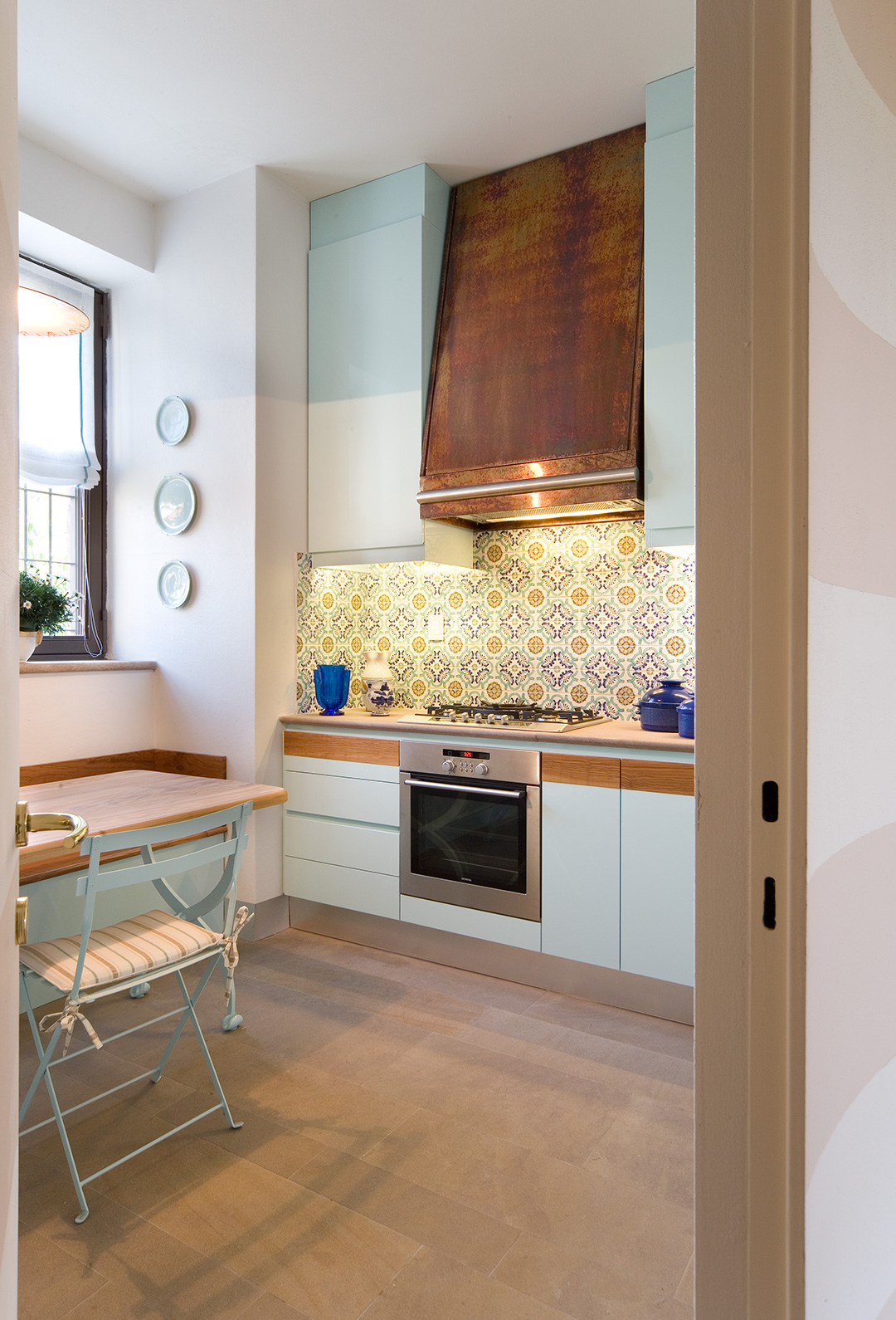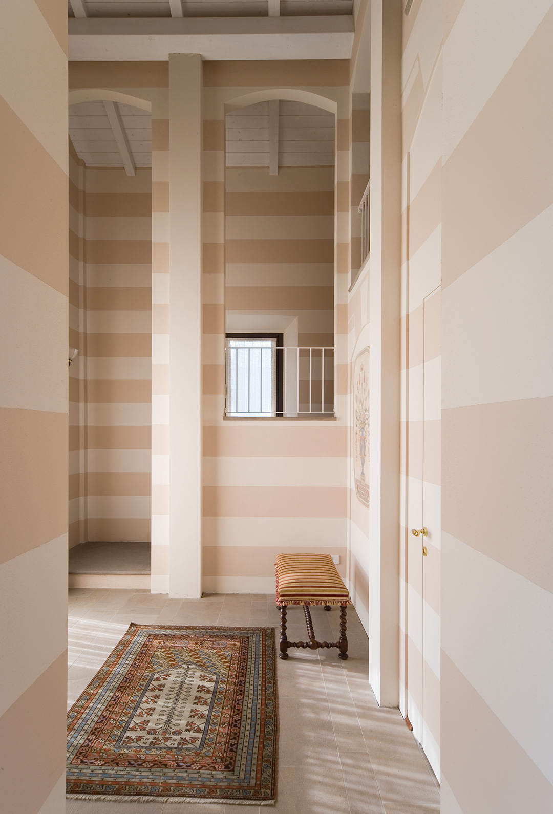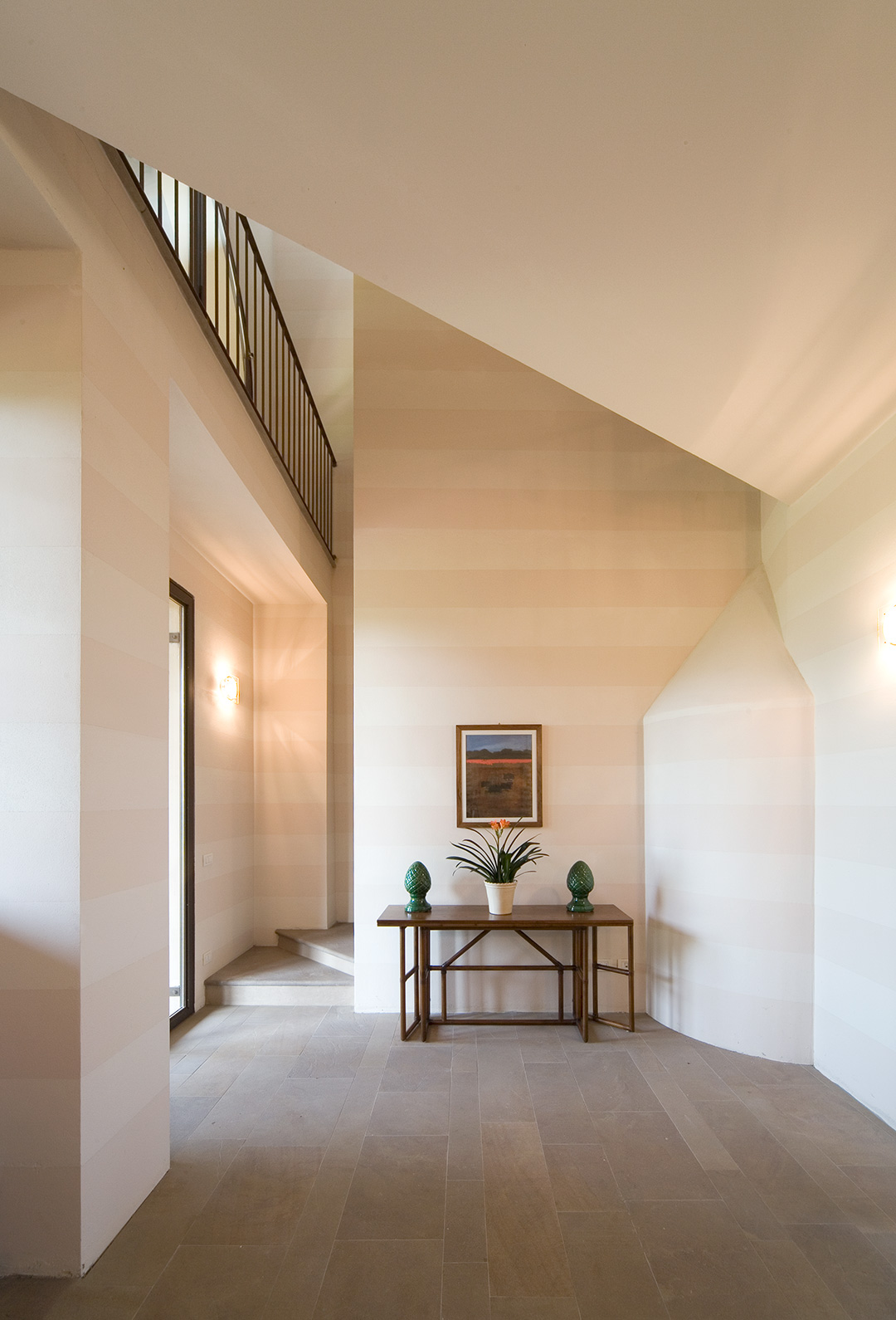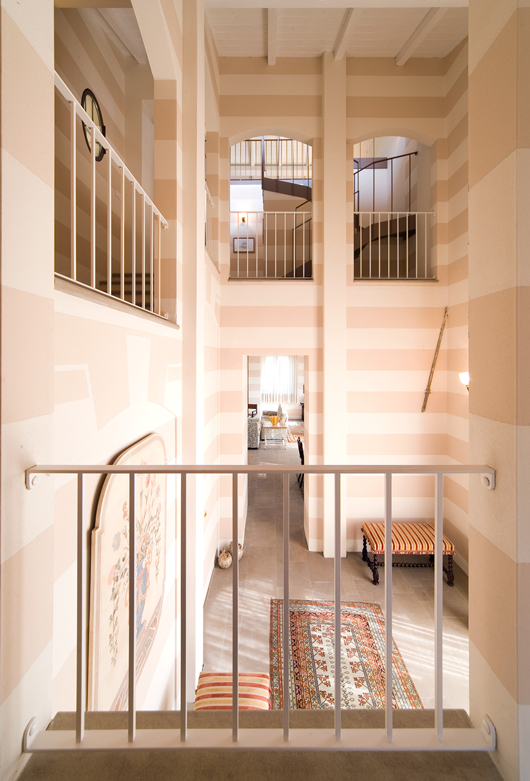 Le due unità abitative condividono il portico, uno spazio pavimentato in pianelle di cotto. Un intervento di restauro e risanamento conservativo che ben coniuga il requisito essenziale di continuità architettonica con le attuali esigenze residenziali; il vuoto viene ulteriormente valorizzato dall'importante sistema di risalita