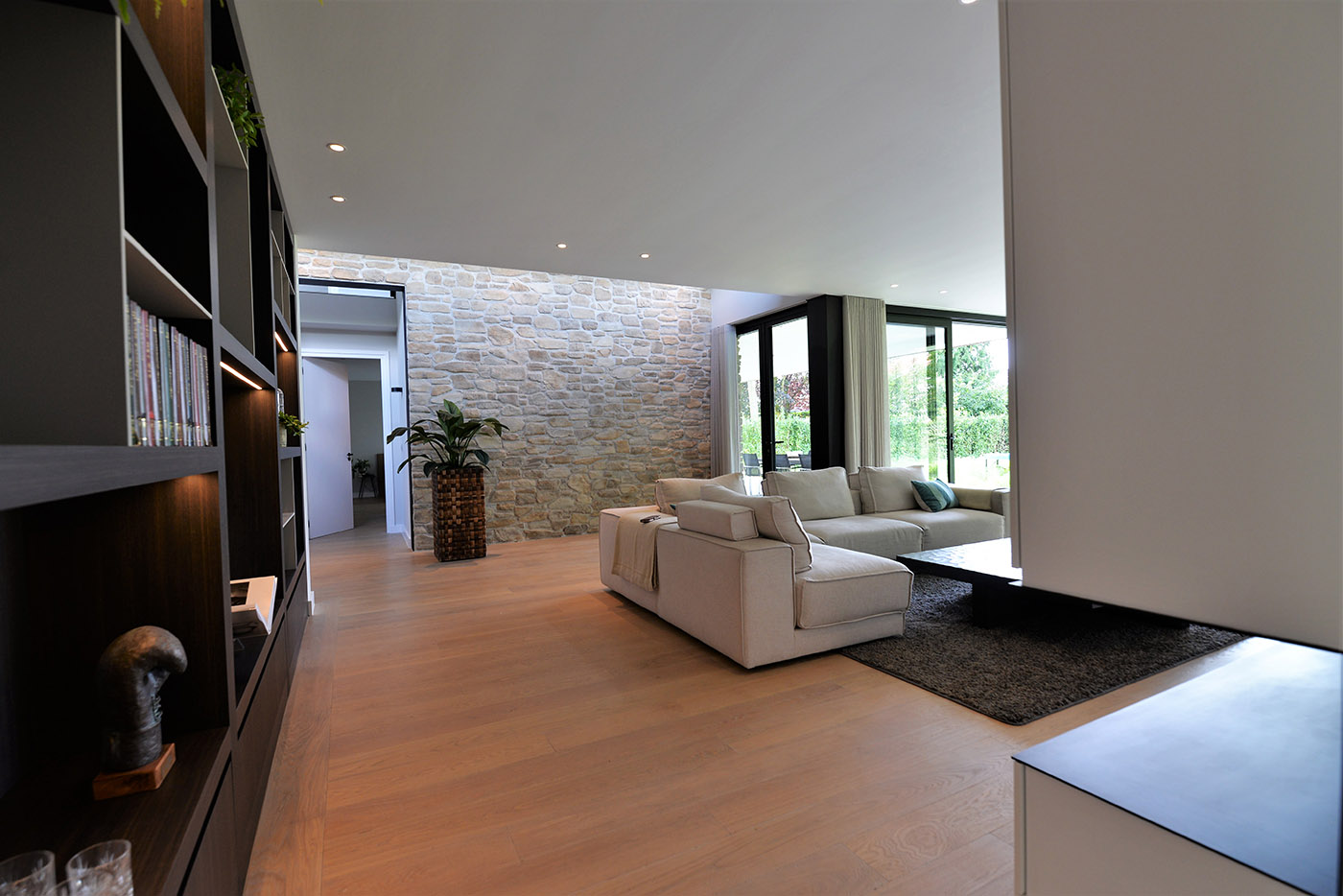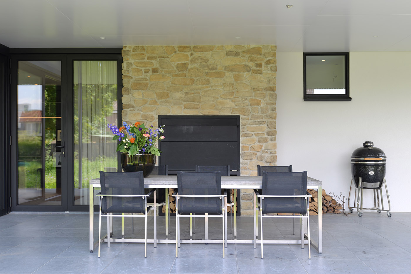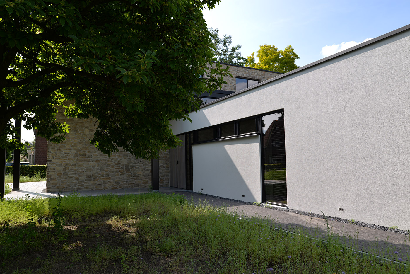 La casa è progettata in modo tale che il dentro e il fuori si fondano perfettamente. La facciata in pietra attraversa la casa dalla parte anteriore a quella posteriore e collega entrambi i livelli del terreno. La terrazza rialzata assicura che la casa sia posizionata su un basamento e che vi sia una differenziazione tra i diversi luoghi del giardino. Nella splendida veranda, che si apre sul giardino, la muratura in pietra diventa un importante camino