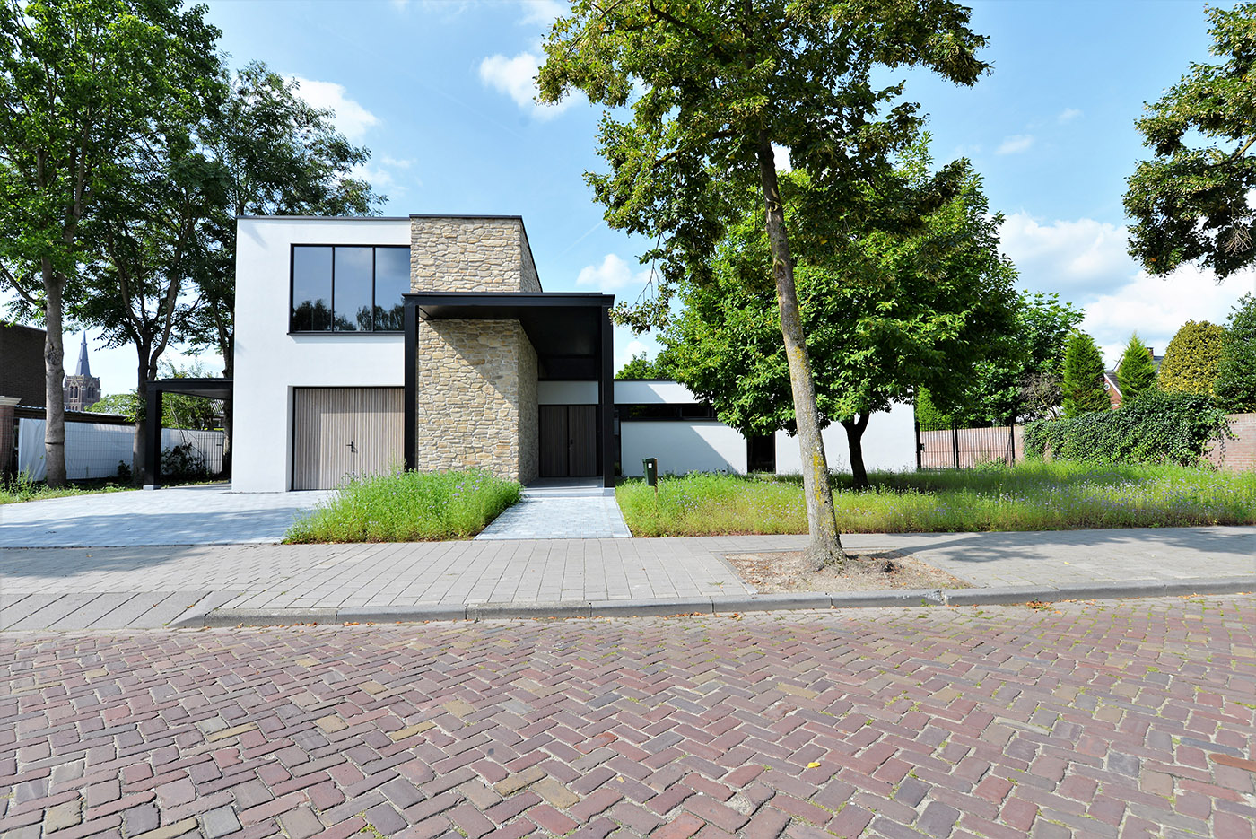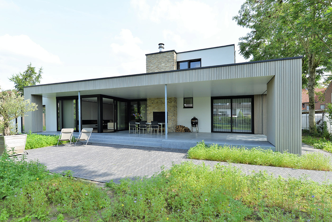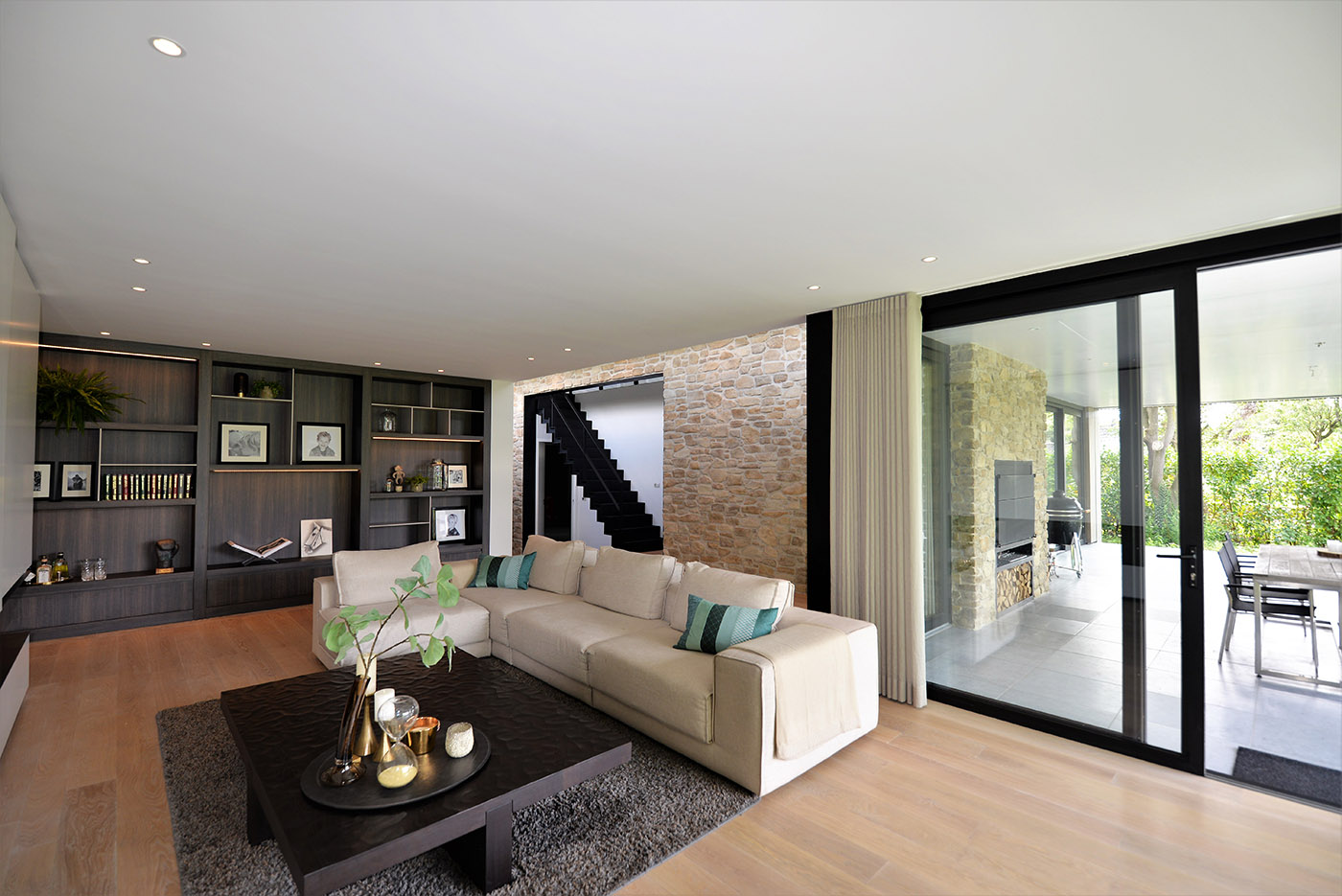 La casa è progettata in modo tale che il dentro e il fuori si fondano perfettamente. La facciata in pietra attraversa la casa dalla parte anteriore a quella posteriore e collega entrambi i livelli del terreno. La terrazza rialzata assicura che la casa sia posizionata su un basamento e che vi sia una differenziazione tra i diversi luoghi del giardino. Nella splendida veranda, che si apre sul giardino, la muratura in pietra diventa un importante camino