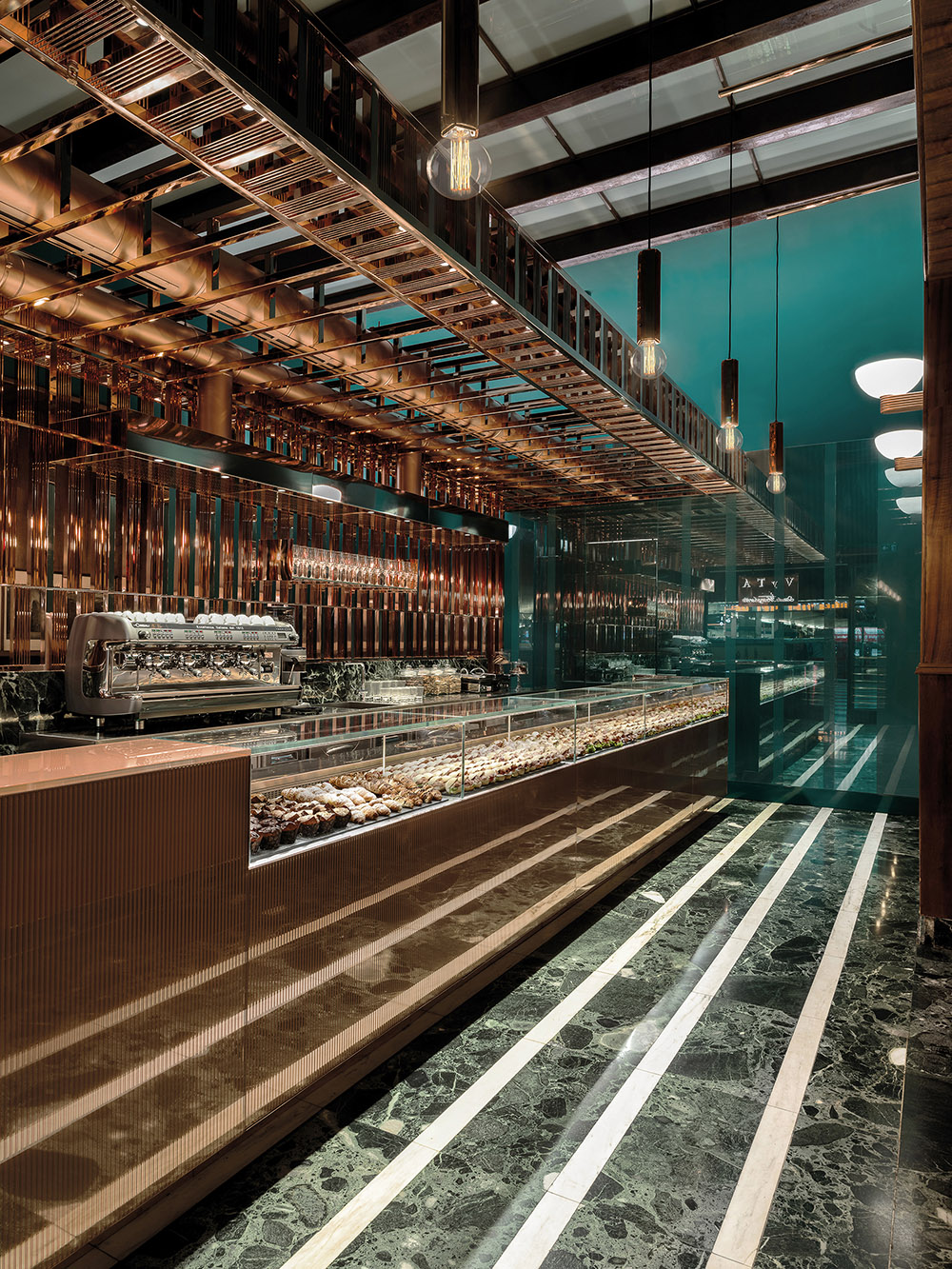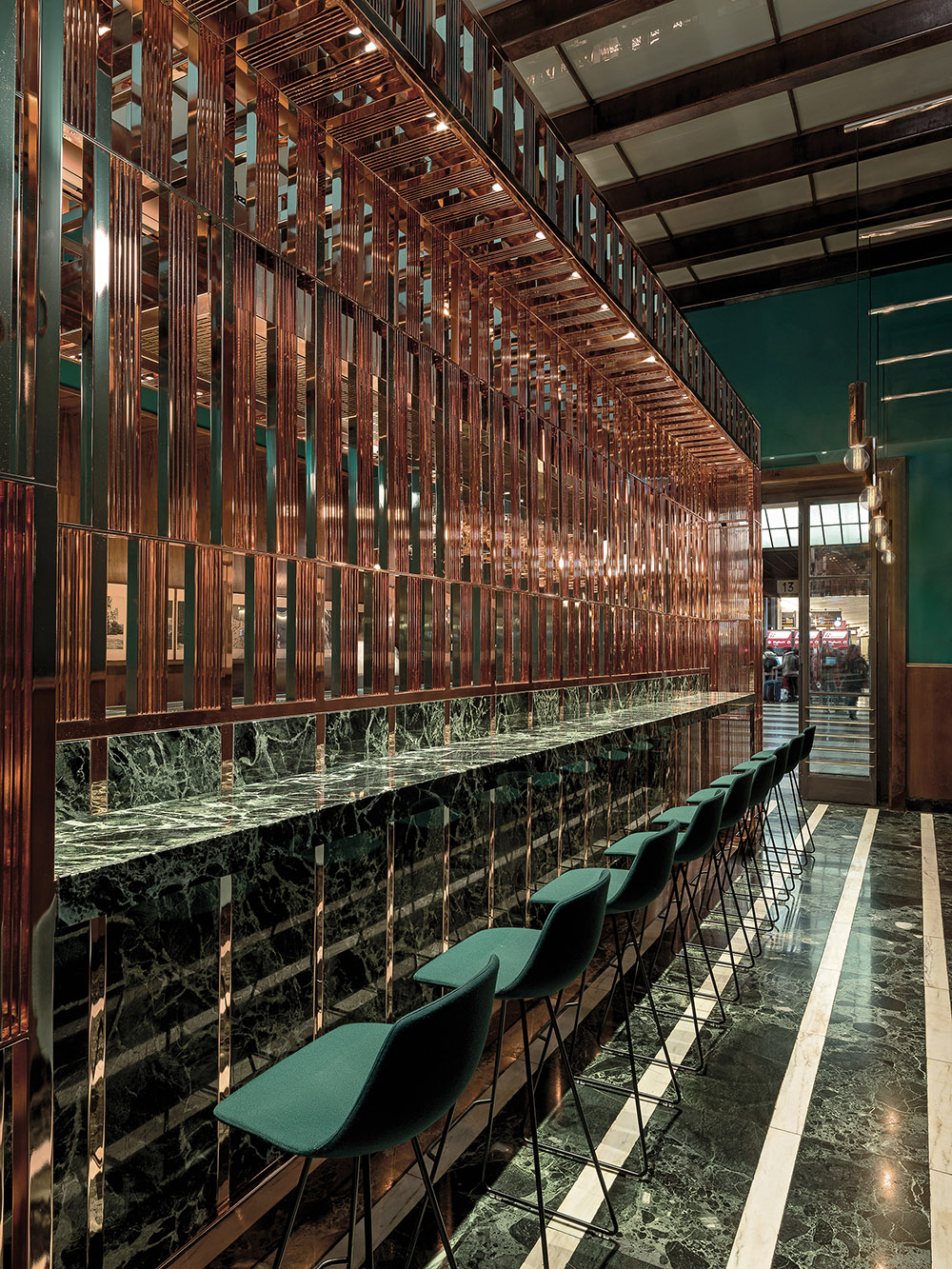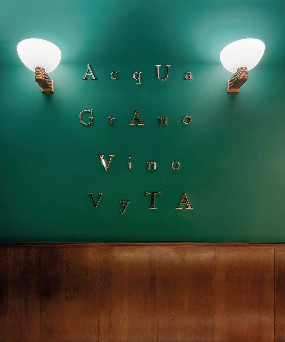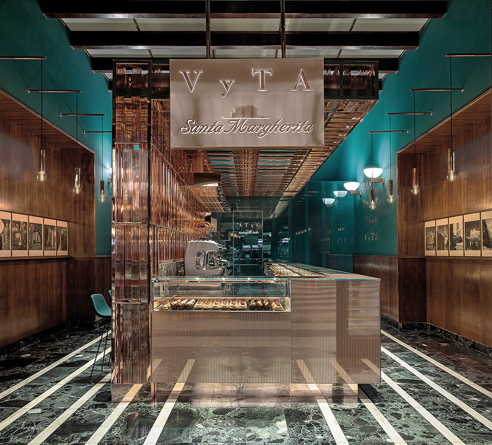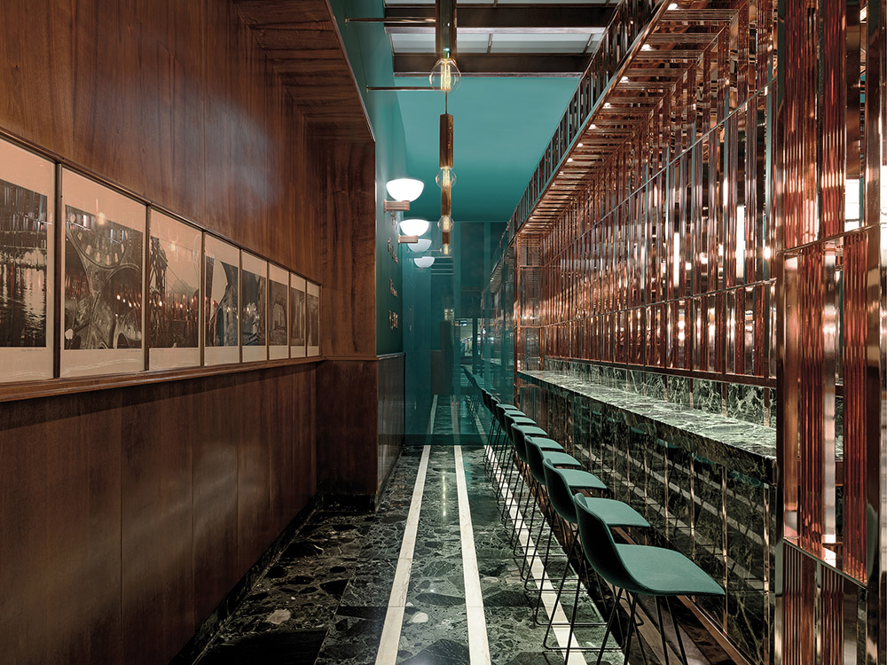 I nuovi elementi di pregio, come rame, vetro e marmo, dialogano con le parti storiche e sono fortemente caratterizzanti. Un elemento in rame pink rosè, dalla forma ad L rovesciata, che contiene gli impianti, coniuga design e funzionalità ed è l'assoluto protagonista