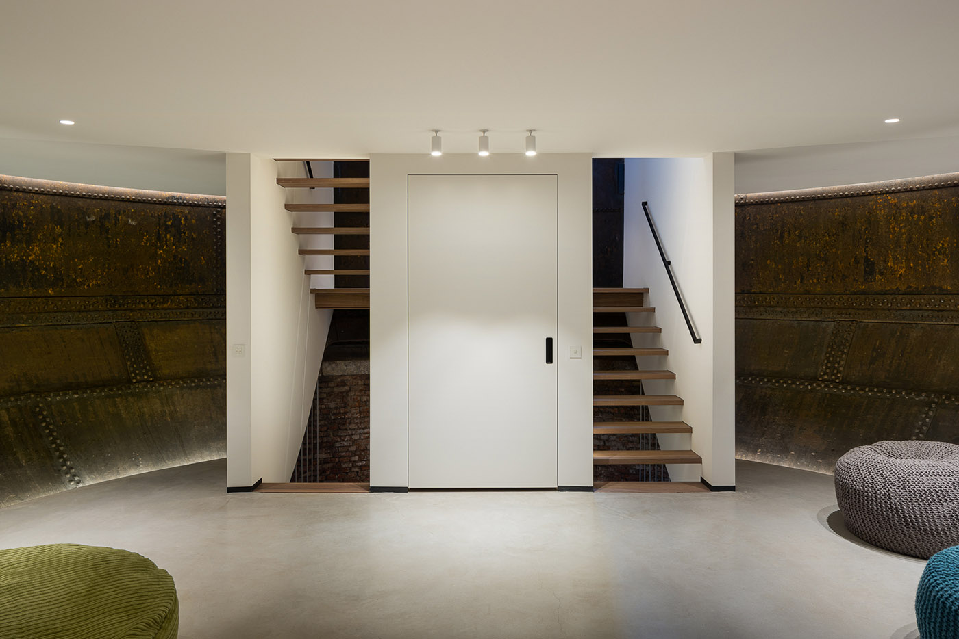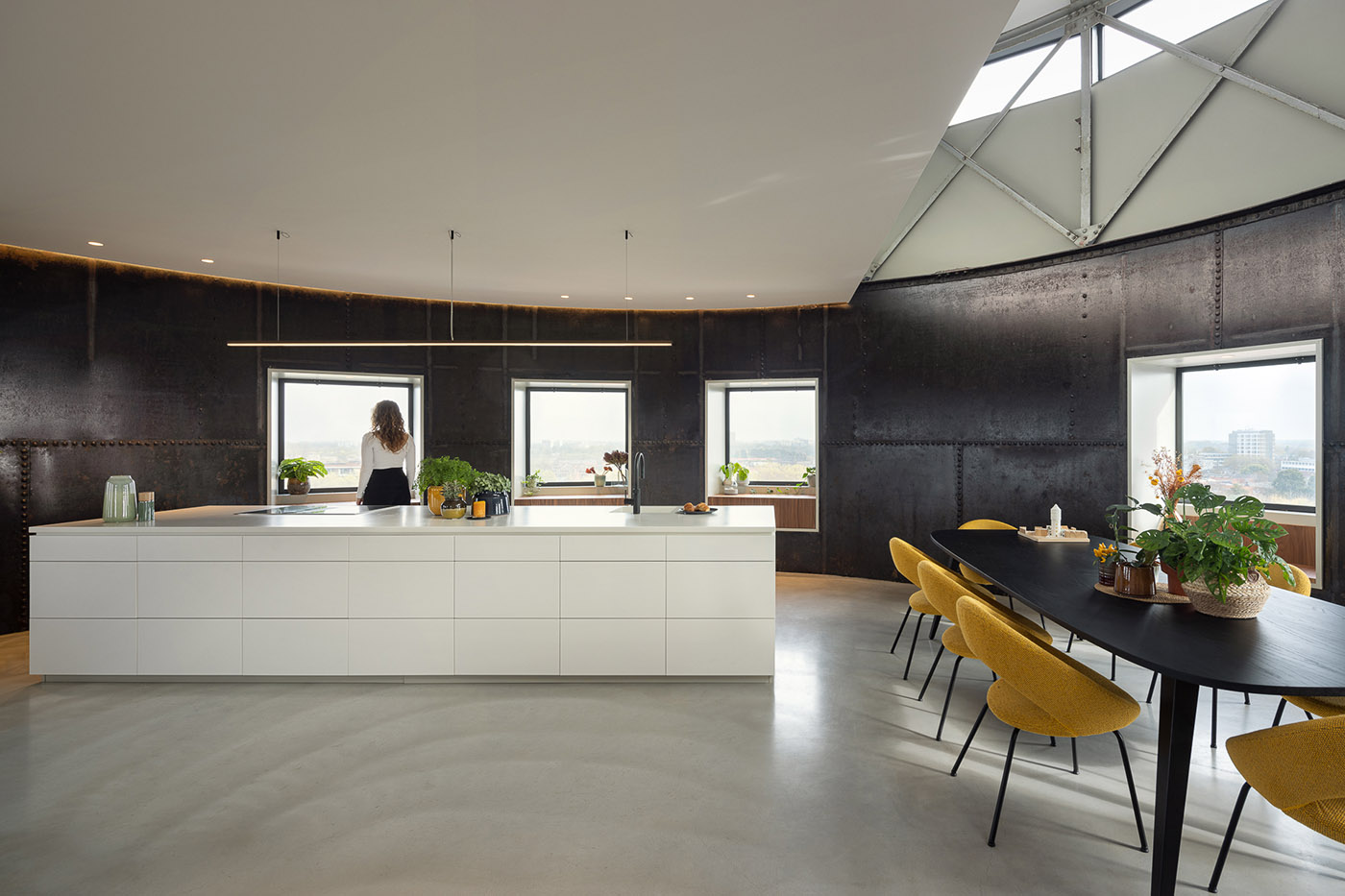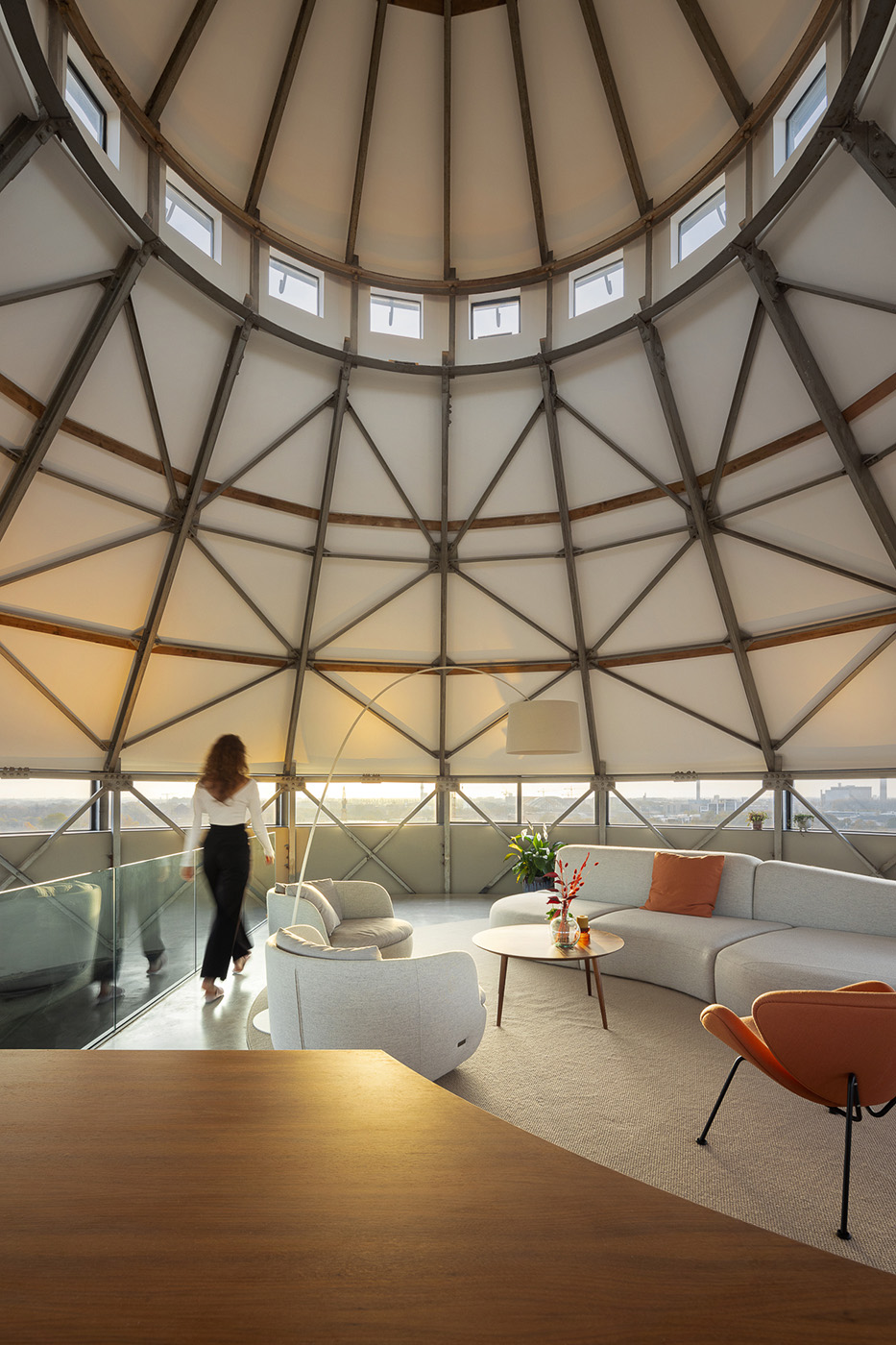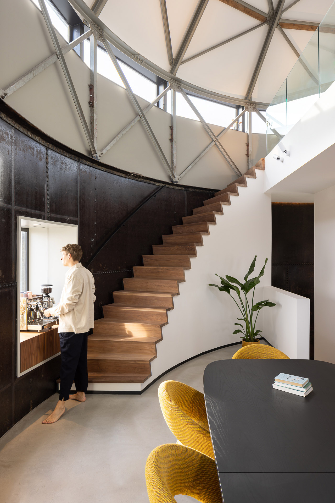 Nel "viaggio" verso l'alto, nella parte inferiore sono state collocate le funzioni più private, come le camere per gli ospiti, la zona relax e il ripostiglio. Lo spazio si apre sempre più verso l'alto, creando uno spettacolare susseguirsi di piani, vuoti e scorci. Le pareti d'acciaio color ruggine del serbatoio sono visibili in tutta la casa. Insieme al pavimento in cemento flottato, conferiscono alla casa un carattere caldo e industriale. I nuovi interventi realizzati con il bianco, i volumi moderni e le parti in noce completano questo equilibrio