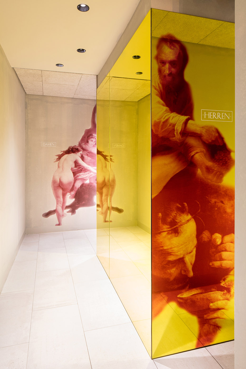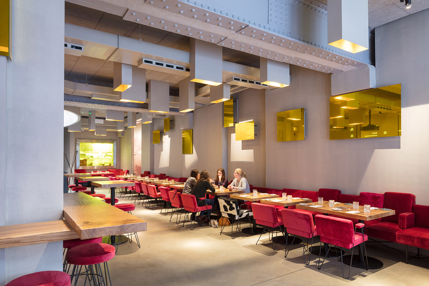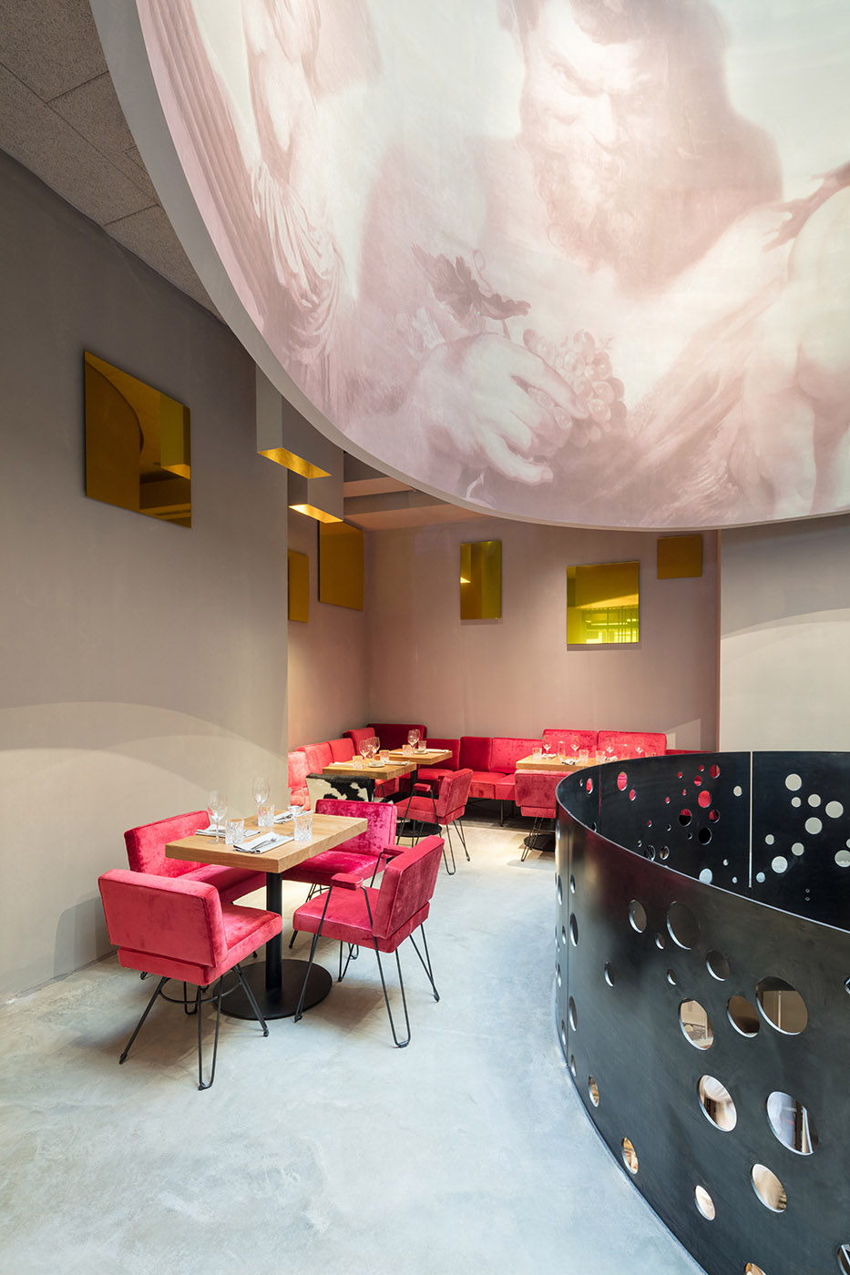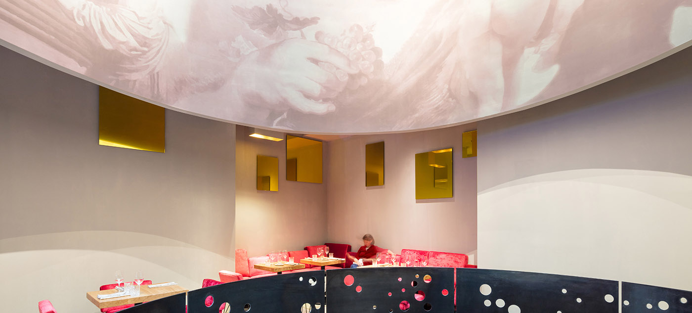 Il ristorante, caratterizzato da affreschi di ninfe, satiri e Bacco, è caratterizzato da un'illuminazione dinamica, progettato nello stile di una brasserie, con morbide panche e poltrone ricoperte di velluto, in contrasto con le pareti grezze della stanza. È presente il motivo dello specchio, importante elemento di arredo nelle tradizionali brasserie, i cui riflessi lasciano dissolvere i contorni aspri della stanza