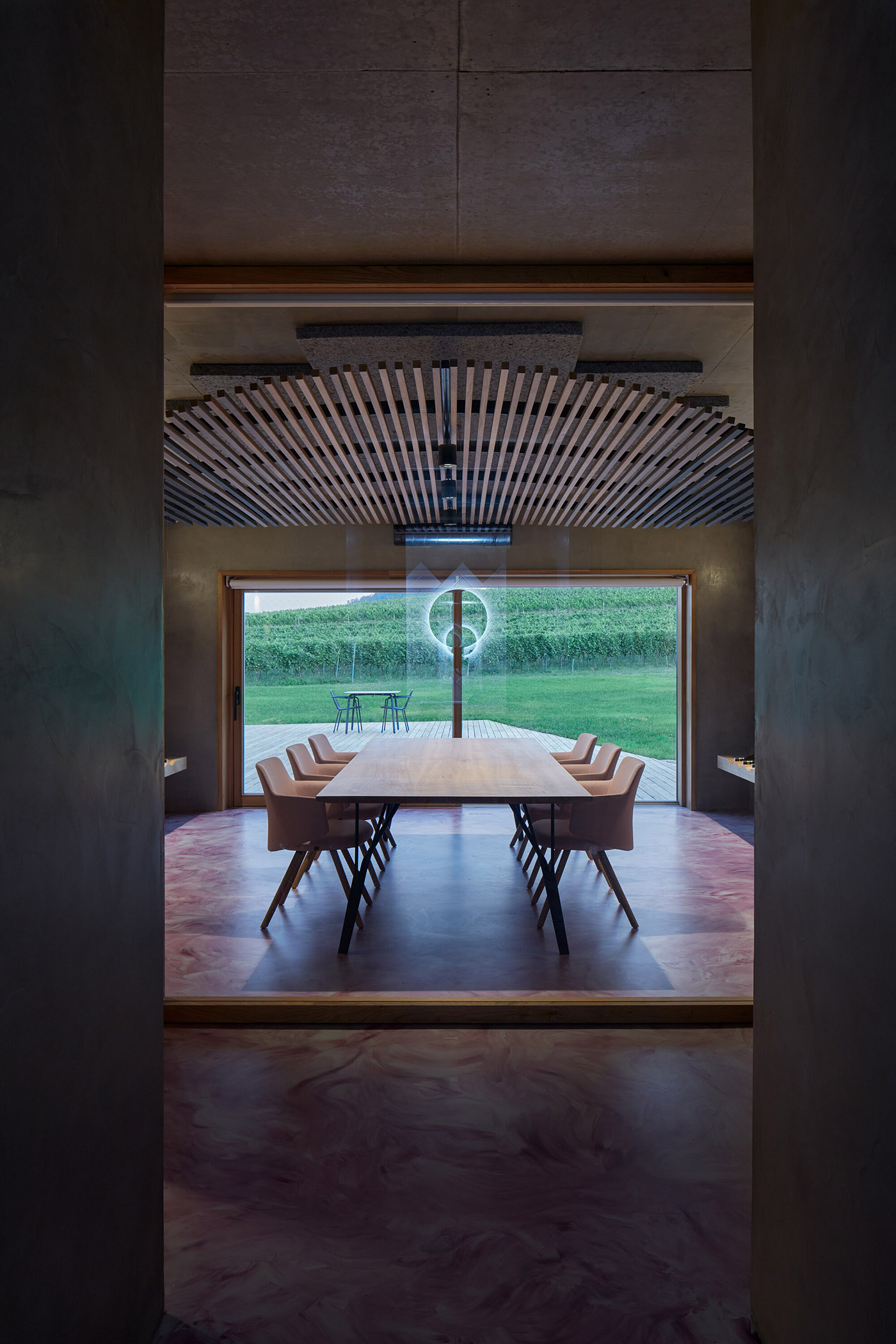 Il soggiorno separato è dominato da un grande tavolo e da un soffitto circolare in legno che nasconde i pannelli acustici e integra l'illuminazione. Sulle pareti sono esposti campioni di terreno provenienti da specifici vigneti della cantina Reisten. Il posto migliore per sedersi è l'ampia terrazza in quercia che si apre sul vicino vigneto e offre una vista del tramonto su Děvín