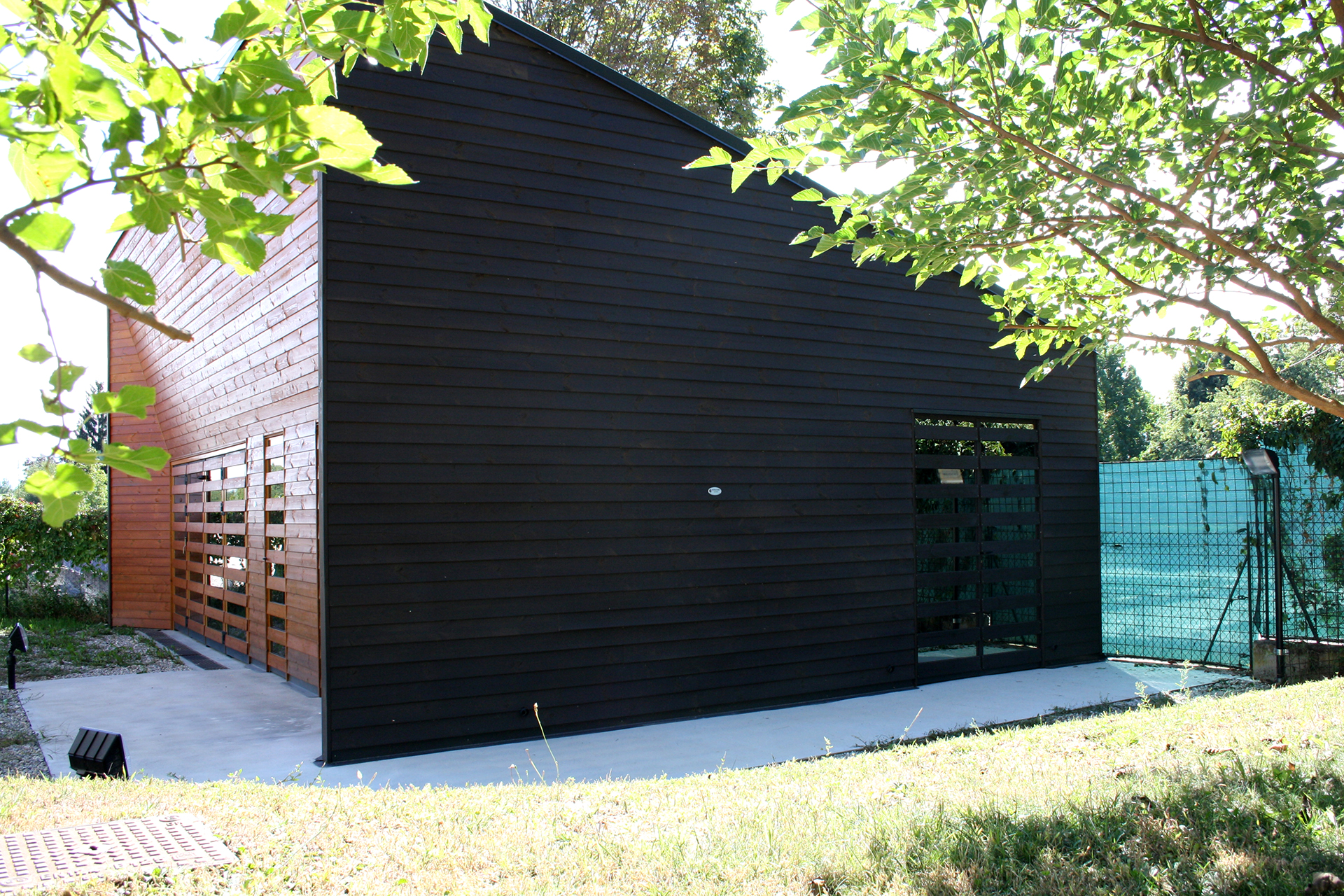 I vetri dei serramenti sono stati scelti in una tonalità grigio fumè e sono specchianti. Il tetto, sempre con struttura in legno lamellare, presenta un unica falda rivestita in lamiera grecata di colore grigio. Le partizioni e i rivestimenti interni sono stati realizzati in legno OSB lasciato a vista