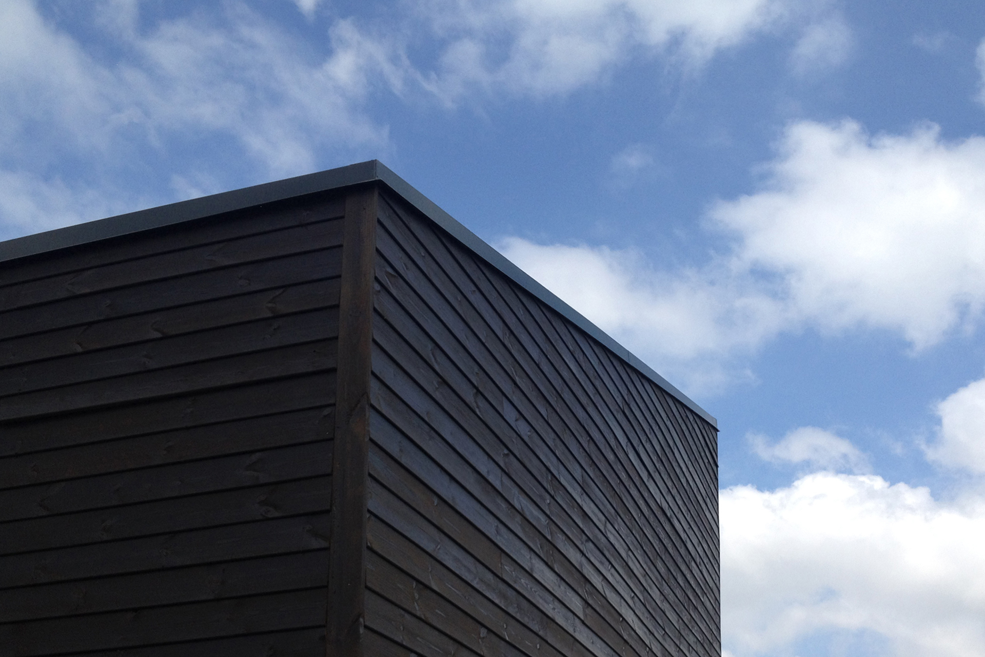 Il “capanno” è stato costruito su un basamento in calcestruzzo armato e la struttura, realizzata con pali in legno lamellare, è ancorato ad esso. L'esterno è rivestito in lamelle in abete di colore naturale sul fronte mentre gli altri lati presentano una colorazione più scura mettendo così in evidenza la facciata dell'edificio