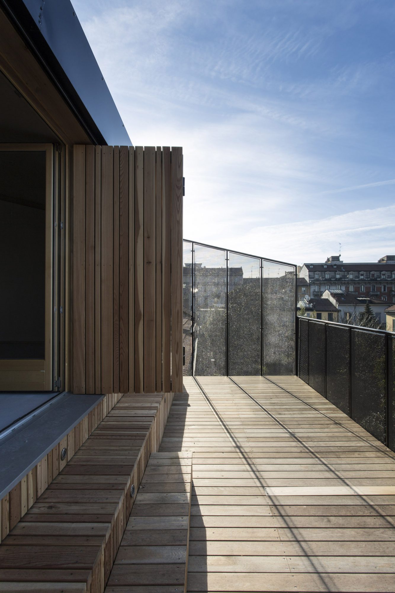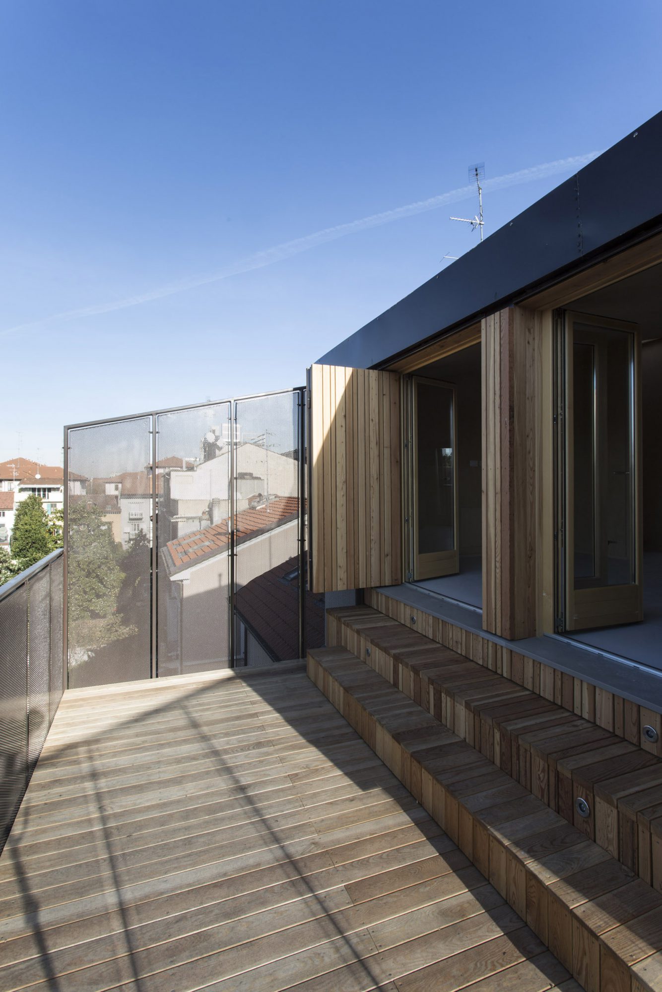 Il nuovo livello del sottotetto diventa uno spazio flessibile che, grazie a pannelli scorrevoli, può essere utilizzato secondo le necessità come una grande zona studio con l’affaccio sui due terrazzi, uno verso strada e uno verso il giardino, con un’area notte ridotta al minimo, oppure come una zona studio rivolta verso ovest e una zona notte verso il giardino a est